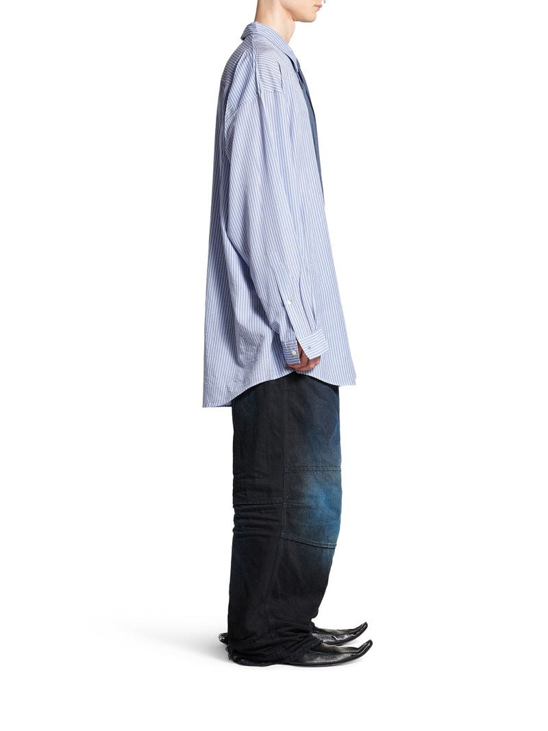 - Fluid striped poplin - Crumpled effect - Unisex - Buttoned collar - 7 buttons on the front - Long sleeves - Rounded hem - Balenciaga engraved buttons