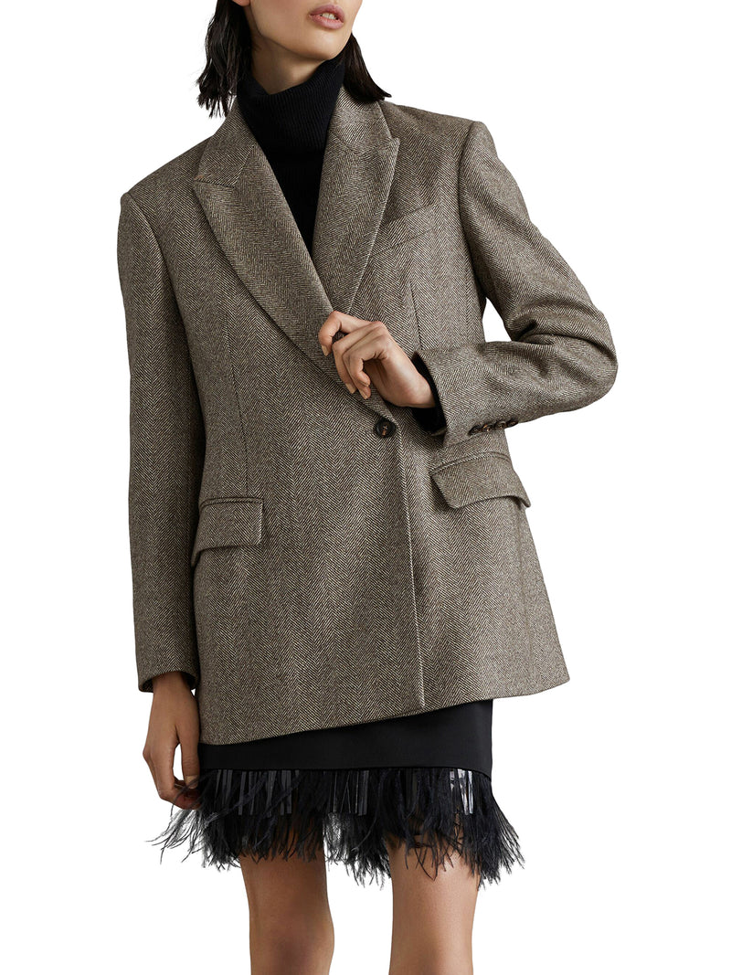 - earth brown - virgin wool blend - herringbone pattern - Monili chain detail - dart detail - peak lapels - double-breasted button fastening - long sleeves - buttoned cuffs - chest welt pocket - two front flap pockets - centre back vent - straight hem