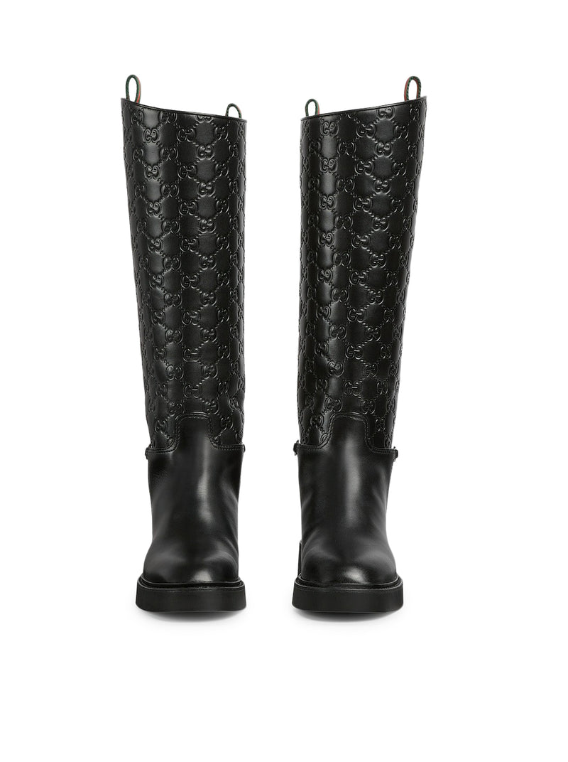 -Black GG leather -Women -Silver-colored finishing -Slim clamp -Web pullers -Leather sole -Elastic inserts -Low model -Heel height: 20 mm; Shaft height: 380 mm