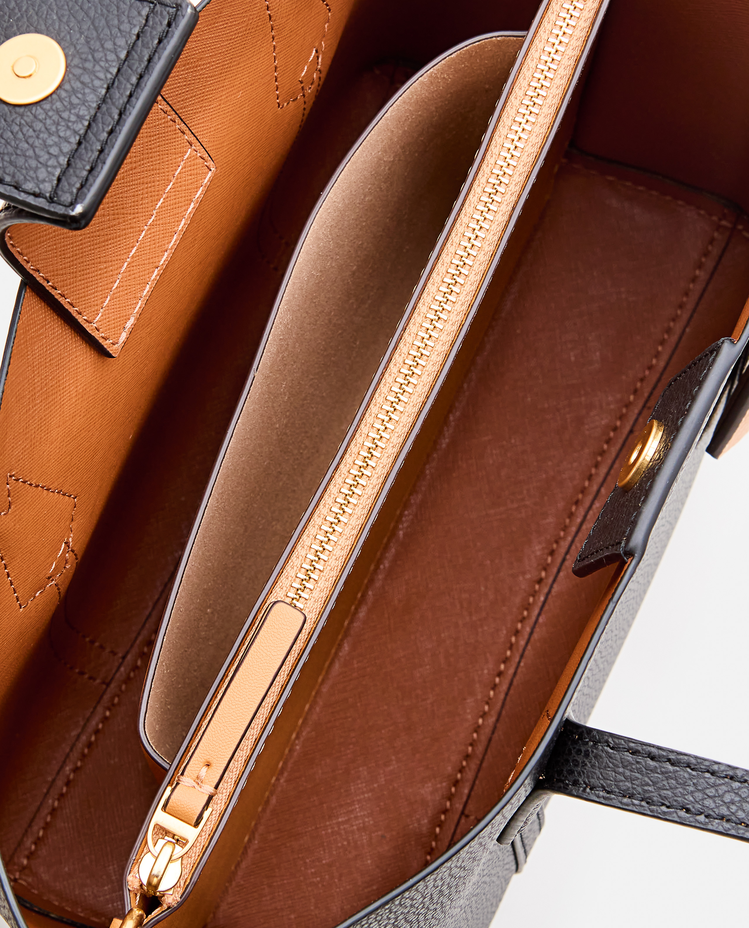 Double top handlesAdjustable and removable crossbody strapHammered leatherRemovable double T pendantZip closureThree internal compartmentsColor: black.