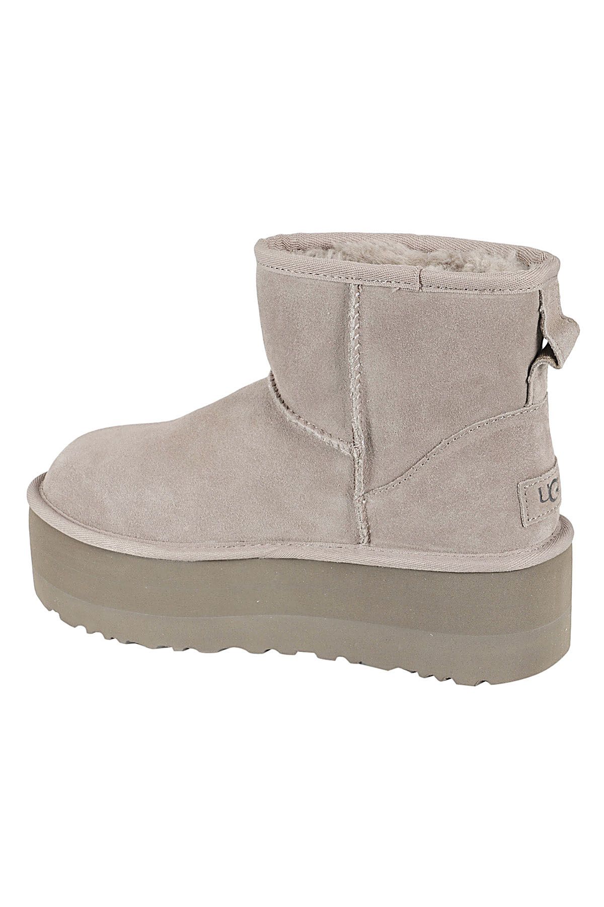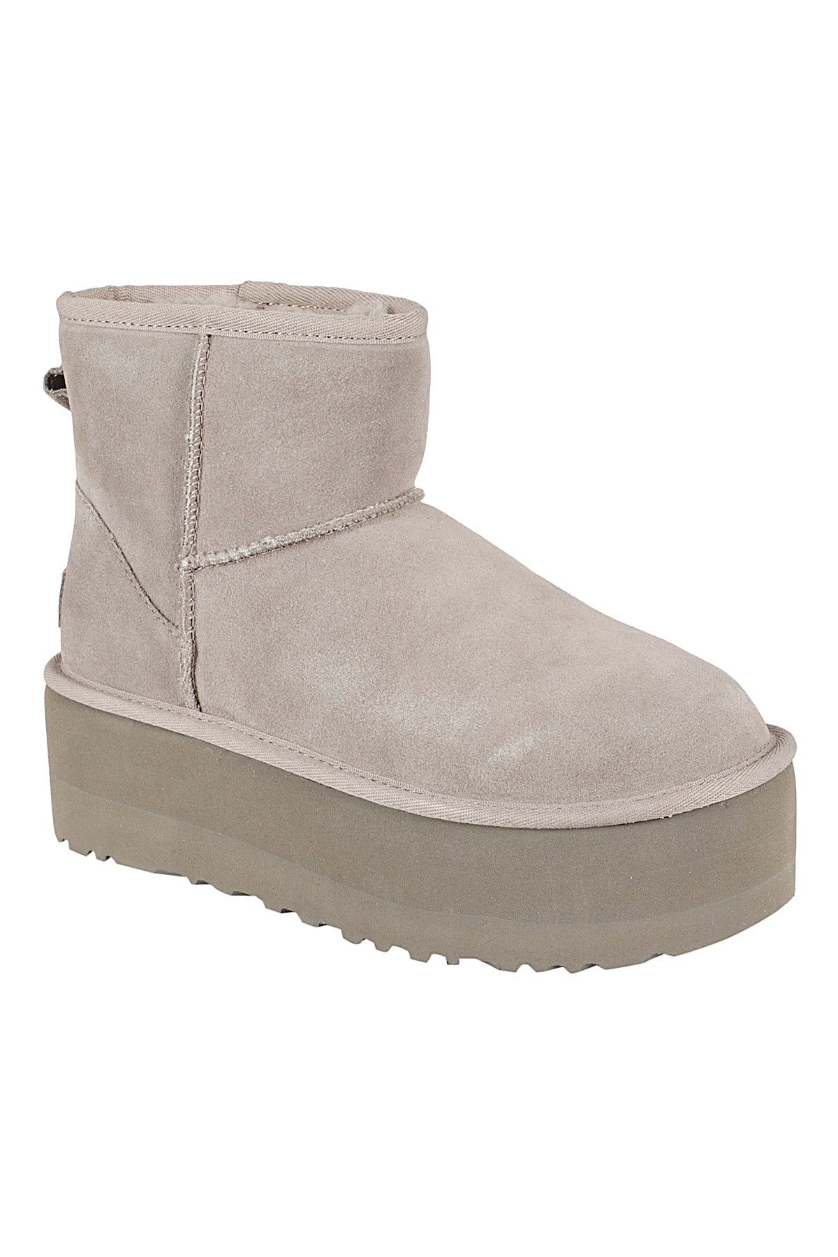 - Classic Mini Platform Boot - Ugg - gray color - suede upper - rubber platform sole - round toe - raised stitching - regenerated wool and lyocell lining