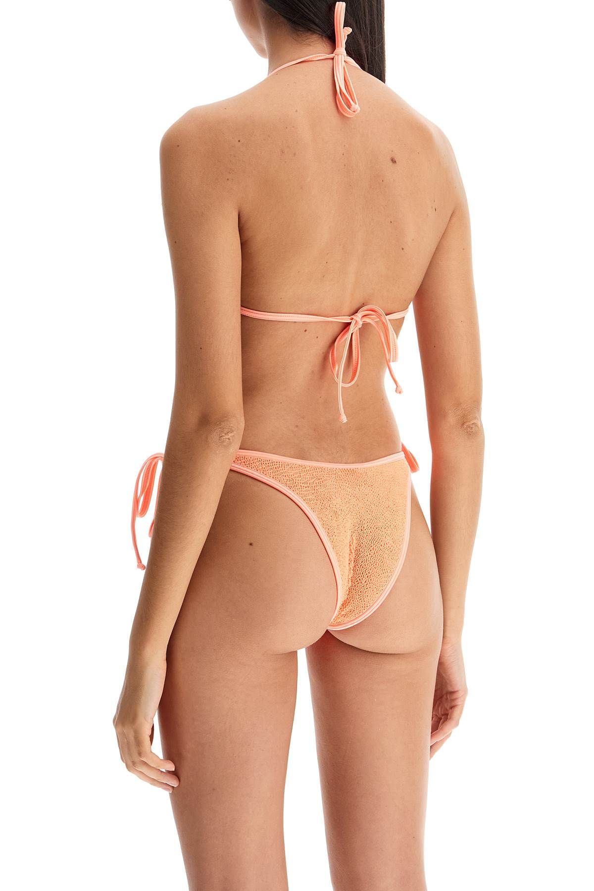 The La Volpe bikini set by Reina Olga is made of stretch embossed fabric, featuring a triangle top and high-waisted briefs with adjustable ties