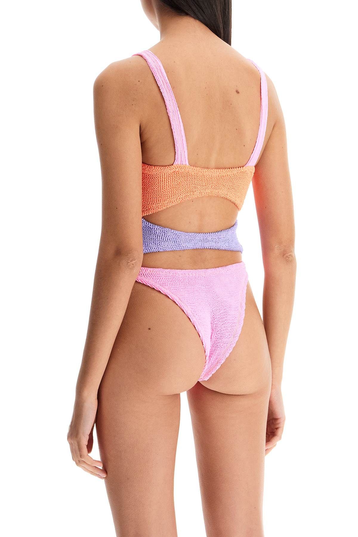 Made with the classic embossed stretch fabric, this one-piece swimsuit by Reina Olga stands out for its cut-out and color-block design with transparent front rings