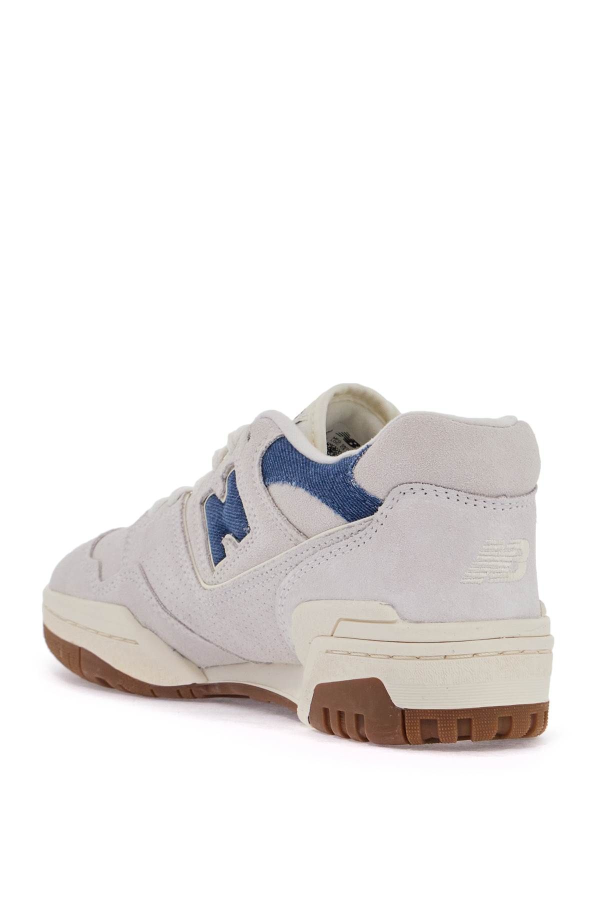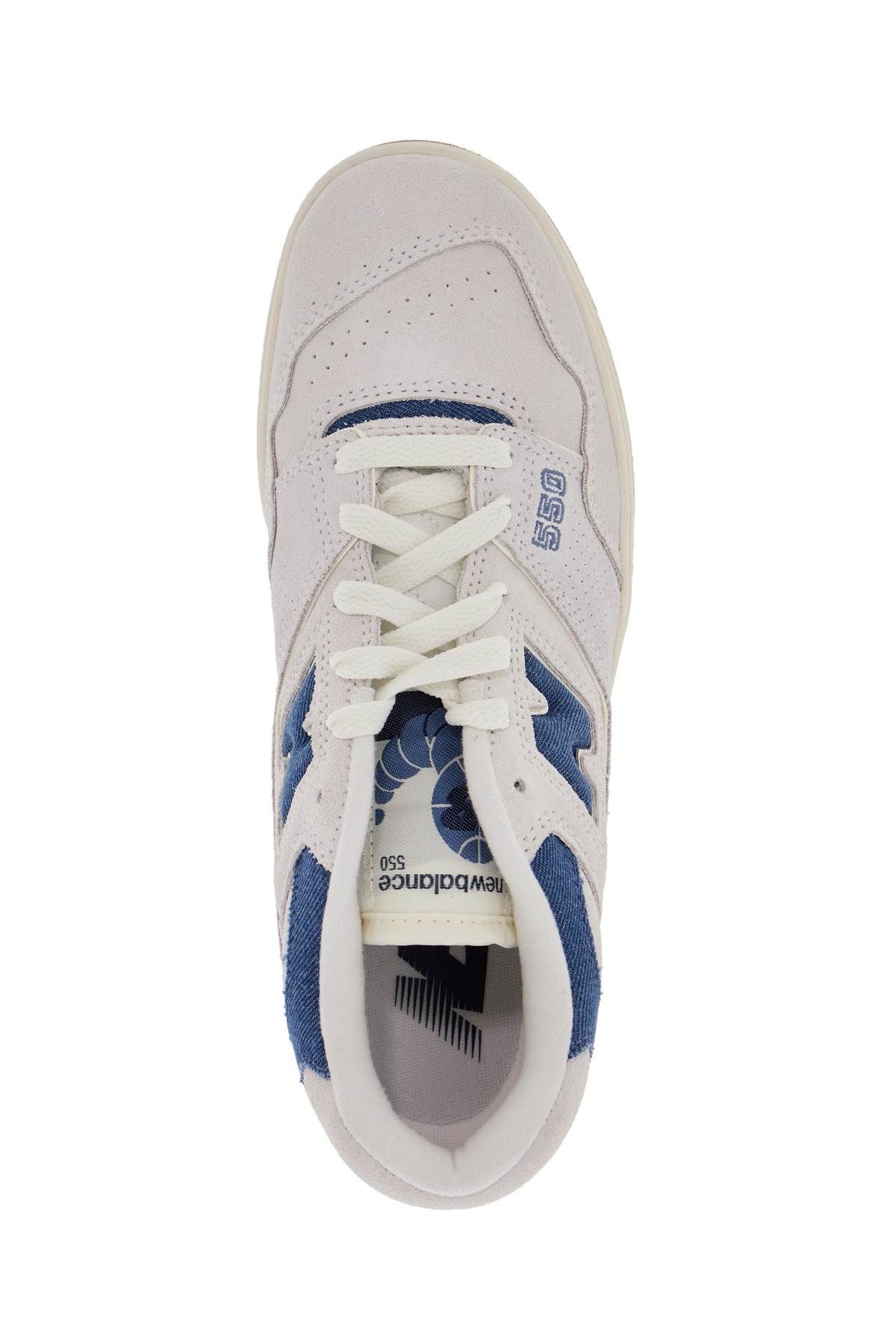 The New Balance 550 sneakers are made of suede leather with contrasting denim effect inserts, side perforations, and the iconic 'N' inlaid on the sides