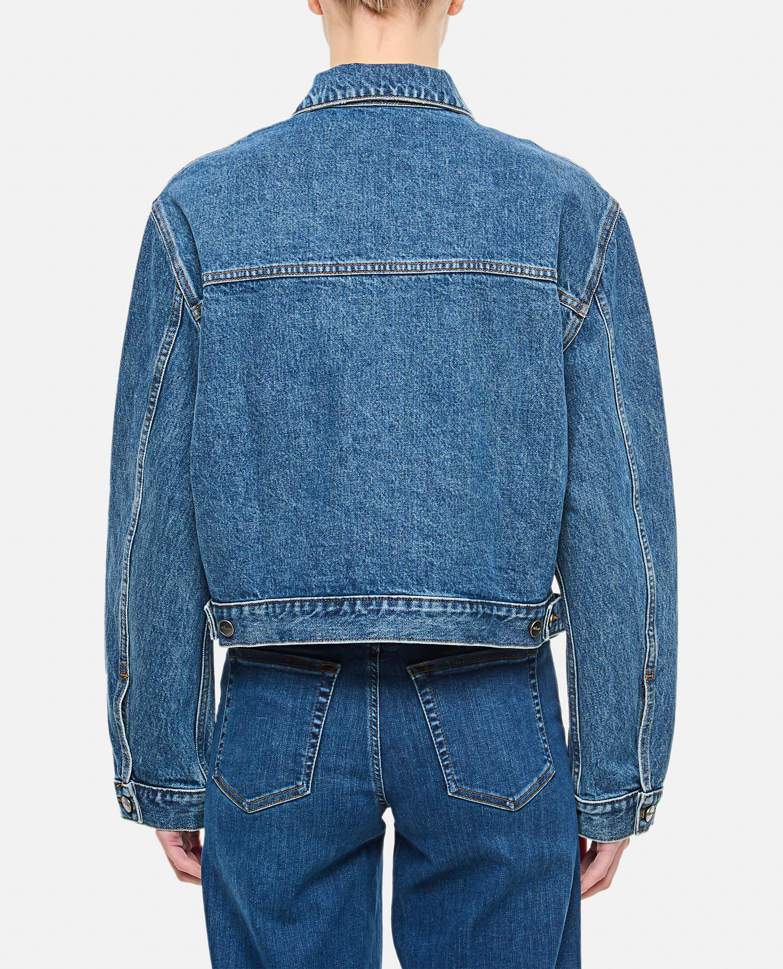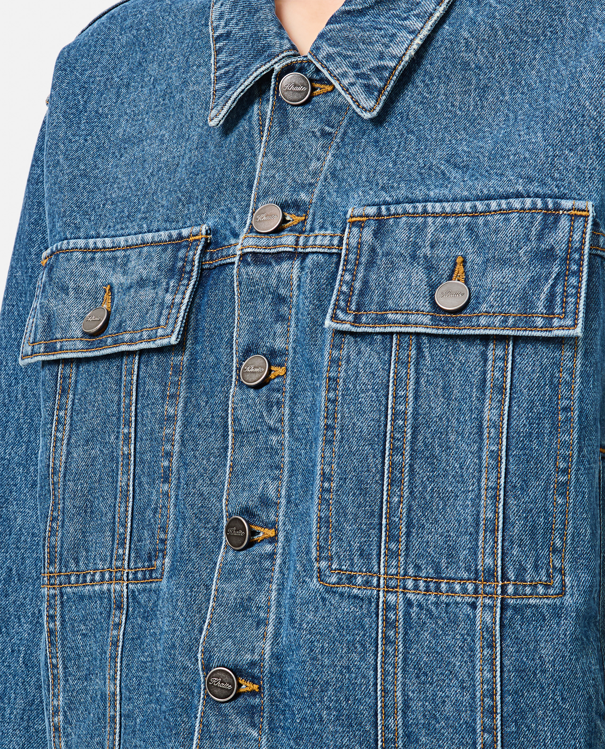 Khaite women's crop jacket in denim, with front closure and buttons. Double side pockets and classic collar. New Arrivals SS25.