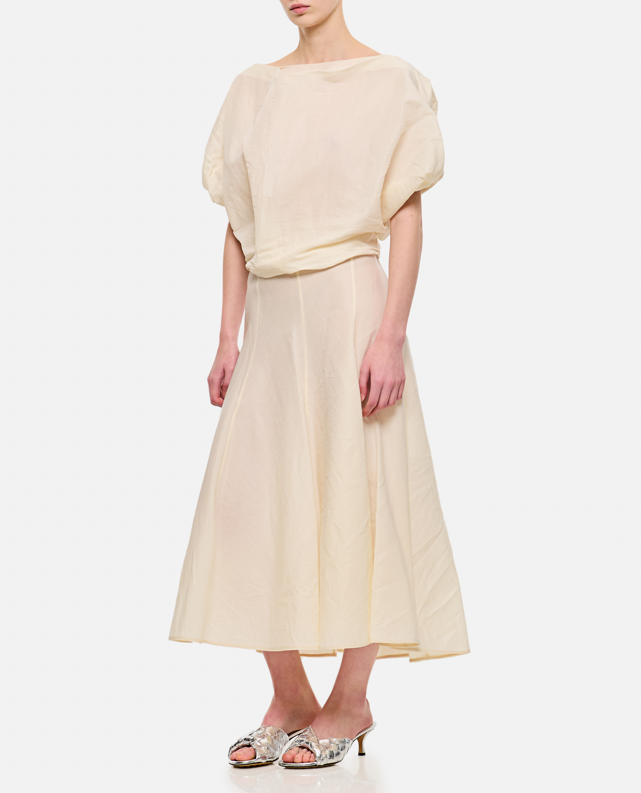 Khaite women's silk Niles top. Loose fit, voluminous cut and puff sleeves. Nude color. Made in Italy. New Arrivals Women SS25.