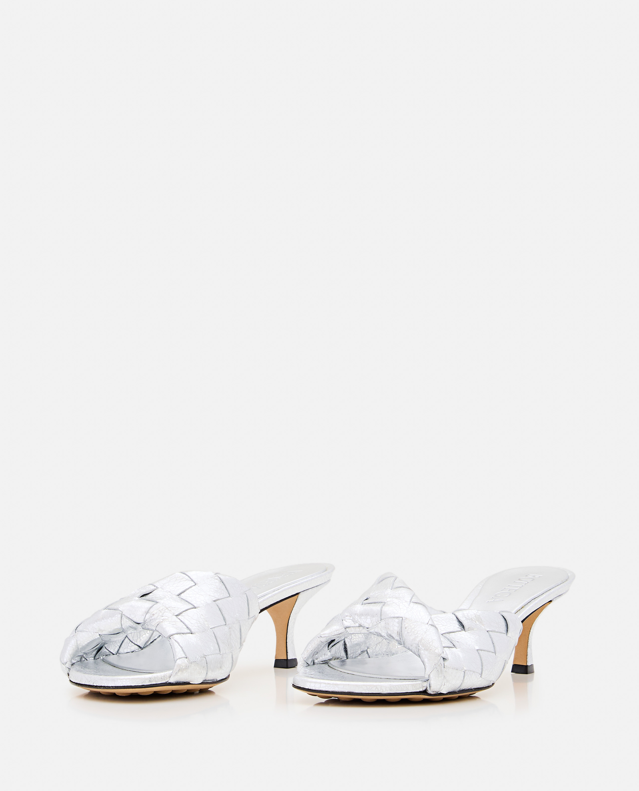 Mule with folded detail in laminated leather with Intrecciato motif.Heel 5 cmColor: silver