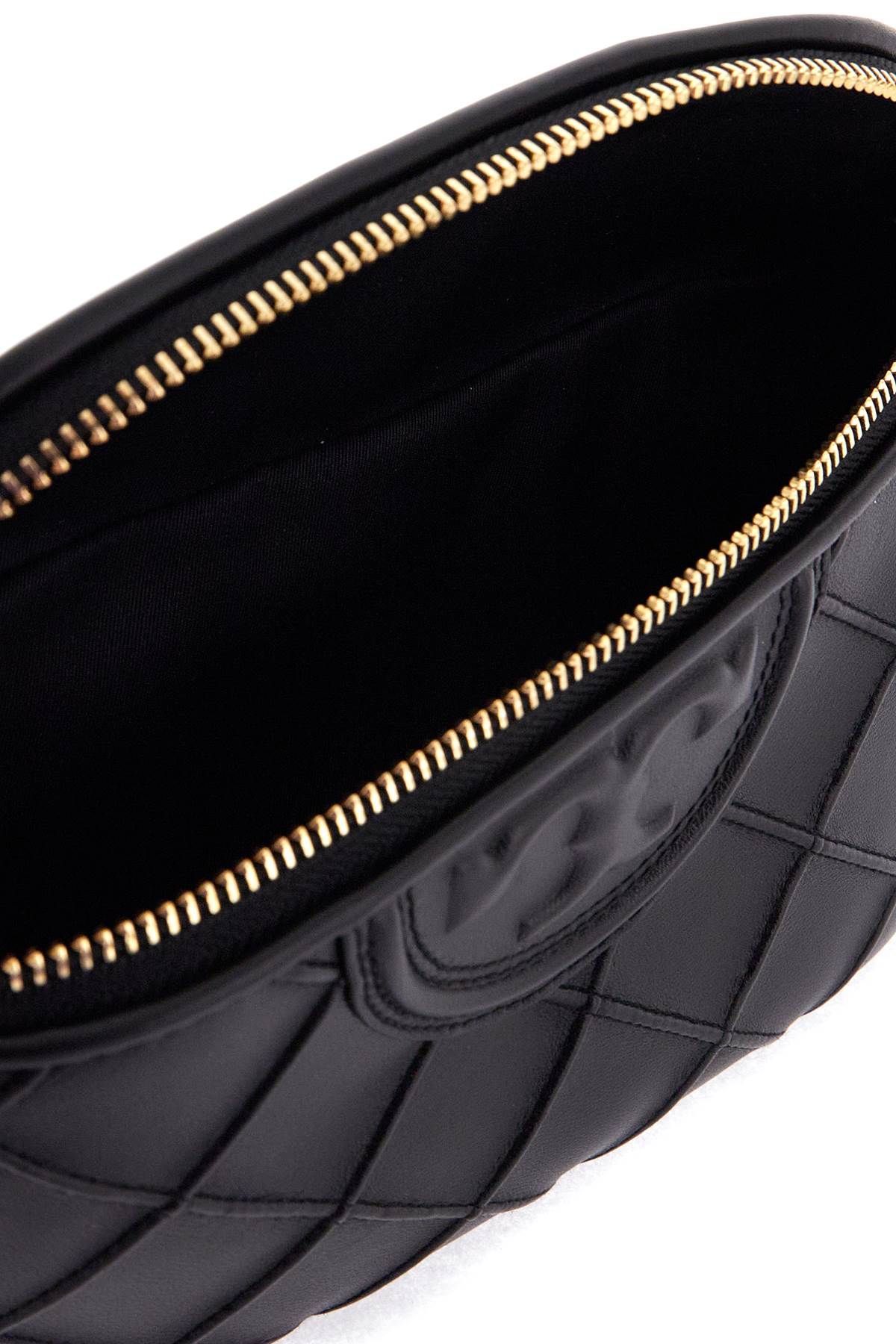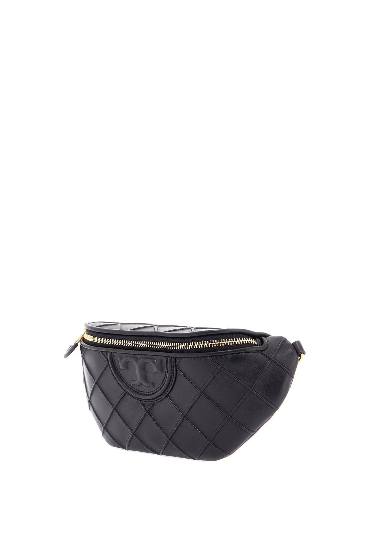The Tory Burch Fleming Belt Bag is made of soft leather with trapezoid pleats and embellished with a double T logo