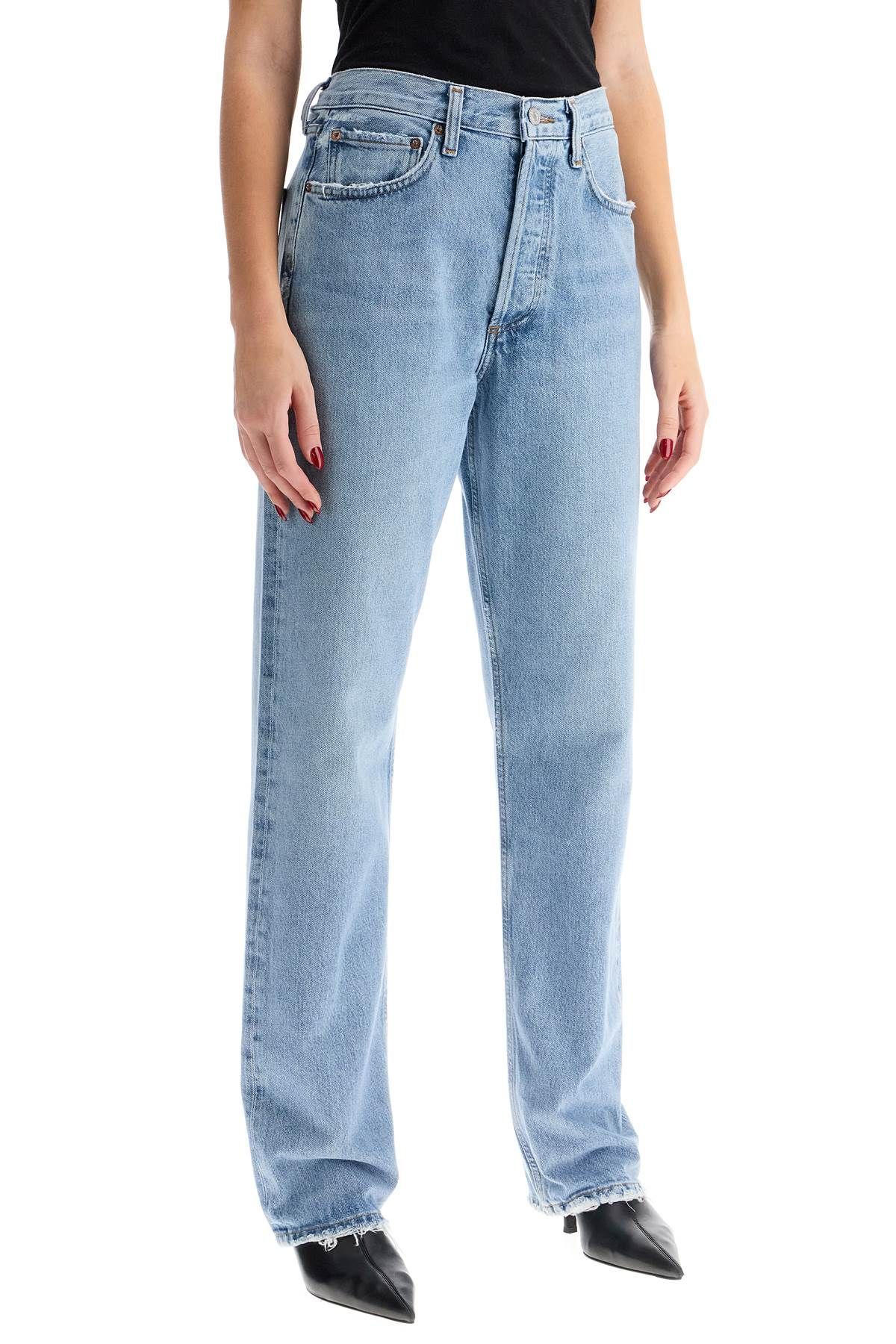 The Kelly jeans by Agolde are made of regenerated denim with a light wash, featuring distressed edges and a high-waisted design with a relaxed straight leg