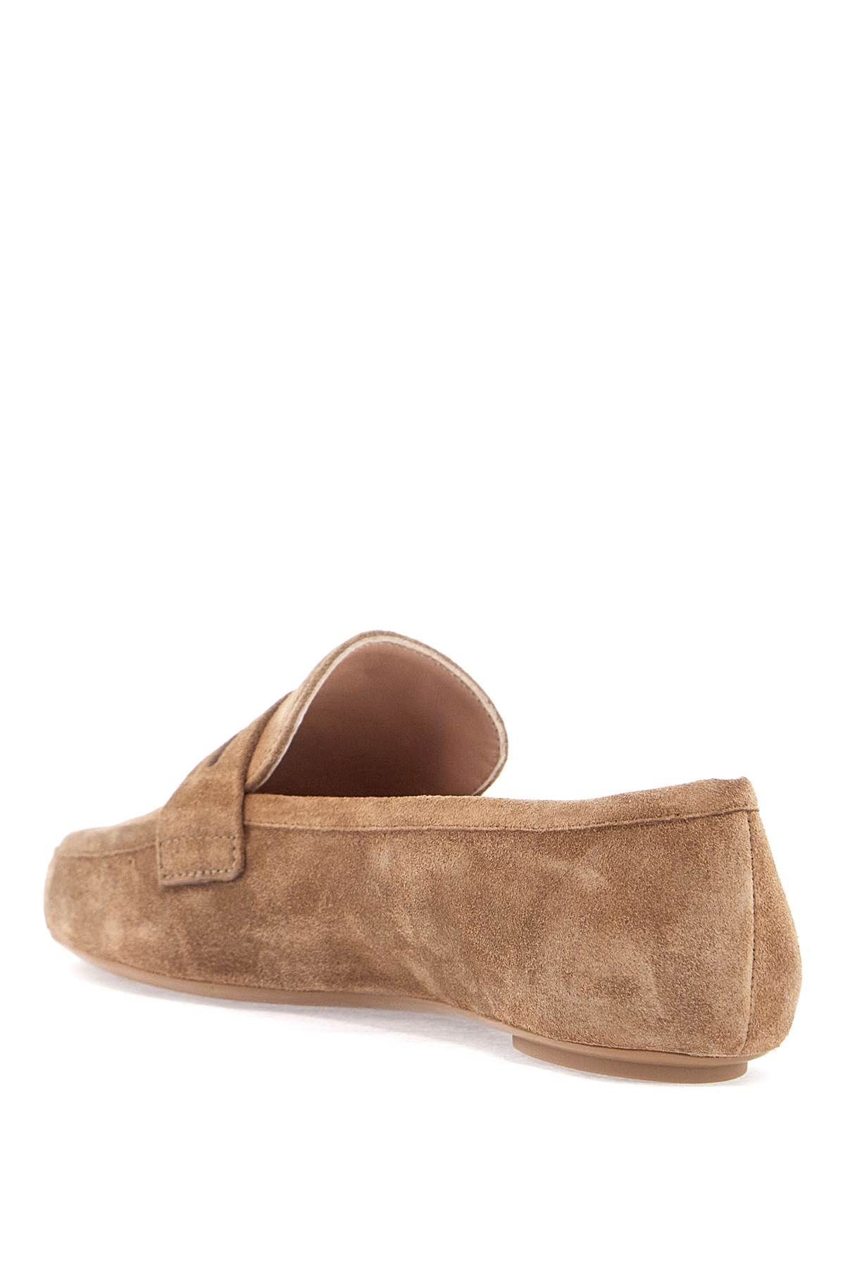 The Giorgia moccasins by Gianvito Rossi are made of suede leather with a rounded toe and embellished with a golden metal Ribbon detail on the vamp