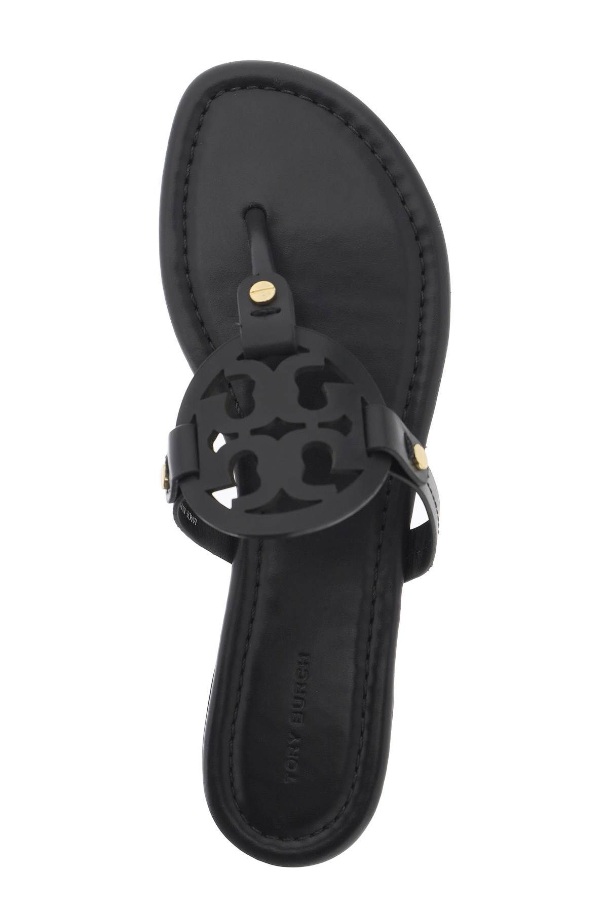 The Miller flip-flop slides by Tory Burch are made of leather and feature a laser-cut logo with hand-painted edges and finished with golden studs