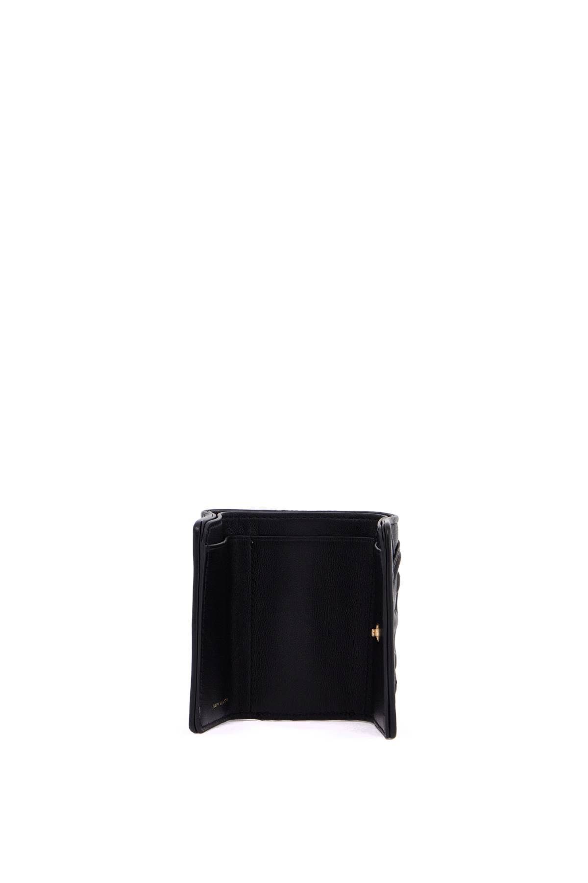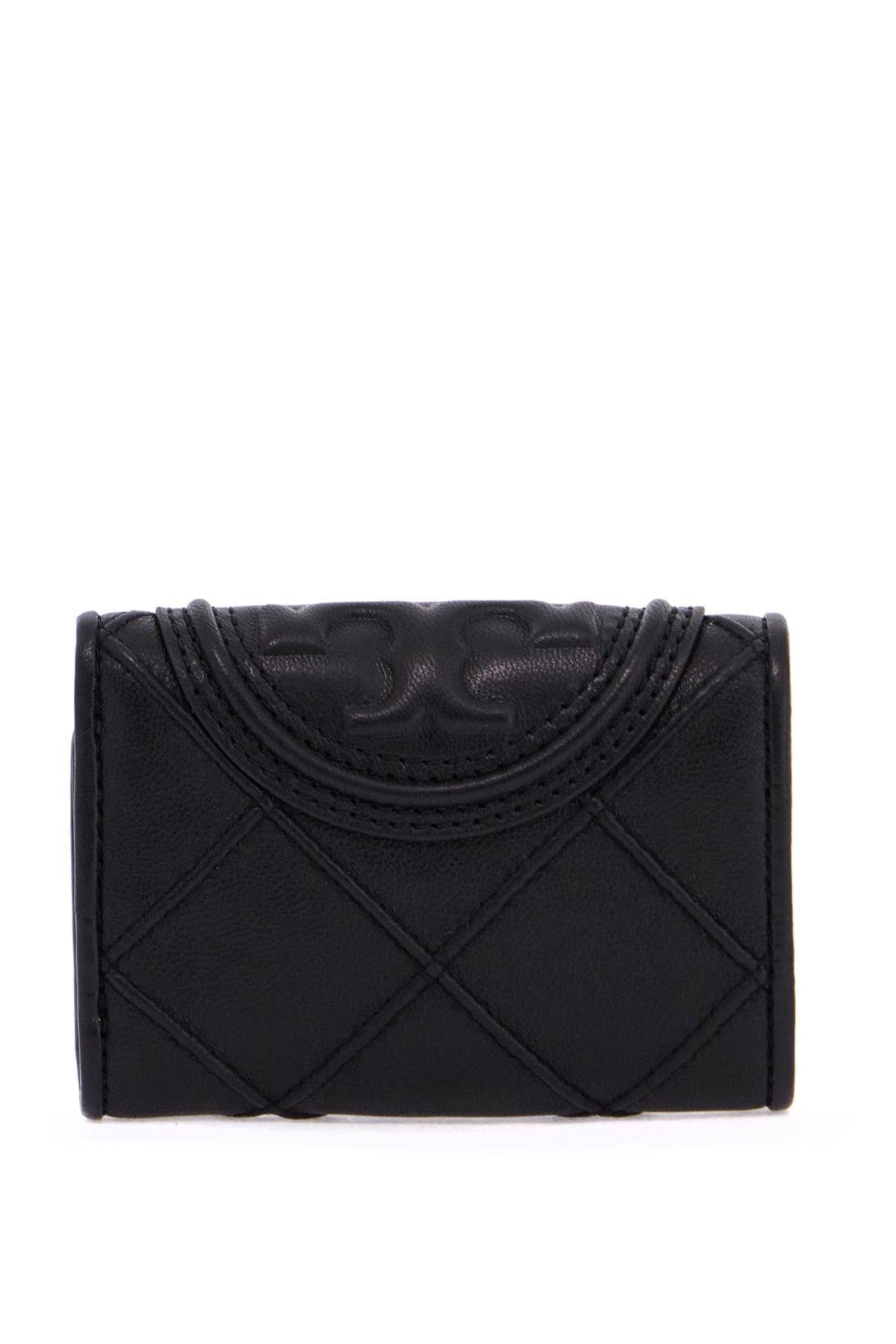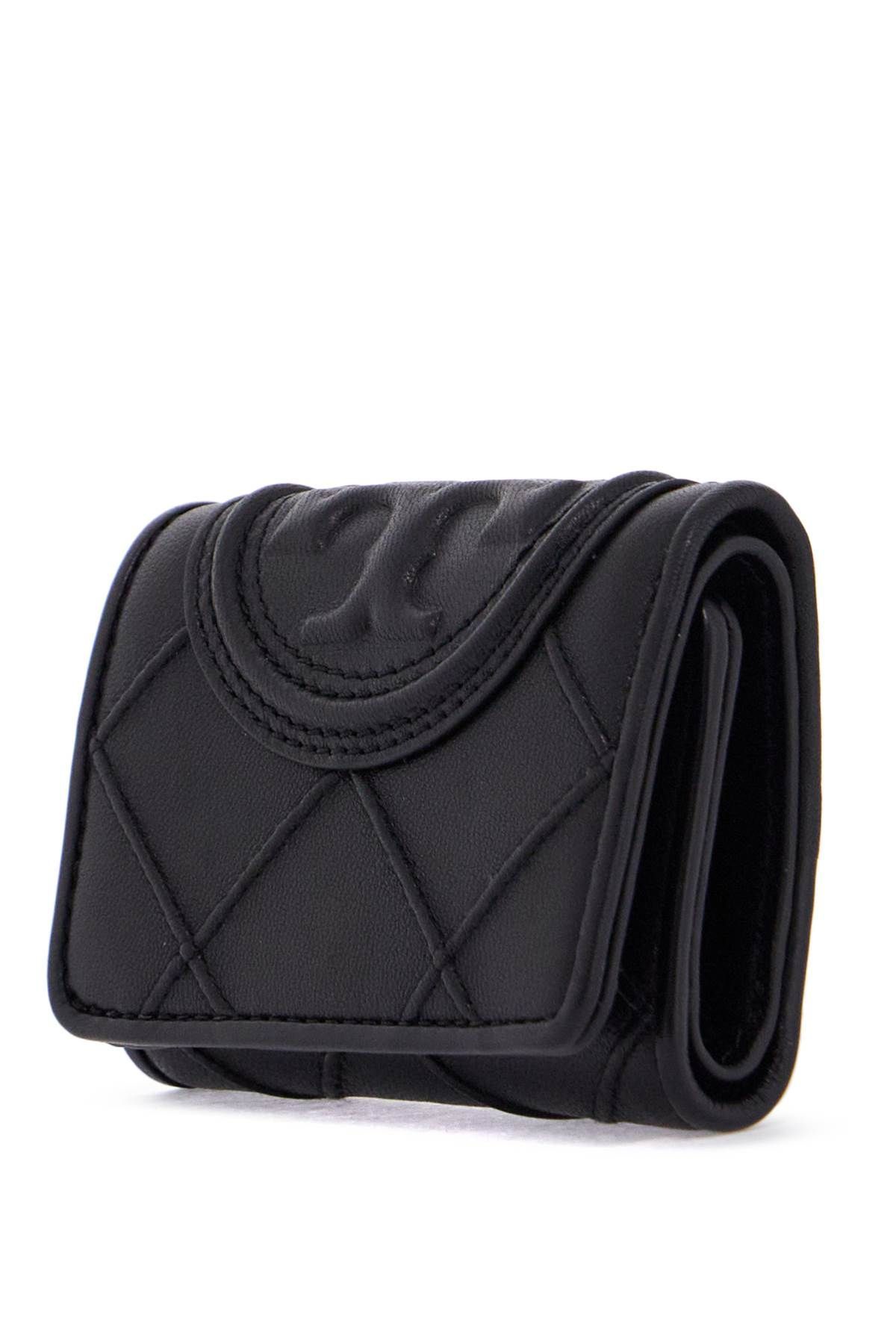 The small tri-fold Fleming wallet by Tory Burch is made of soft quilted diamond-embossed leather and features an oversized Double T logo
