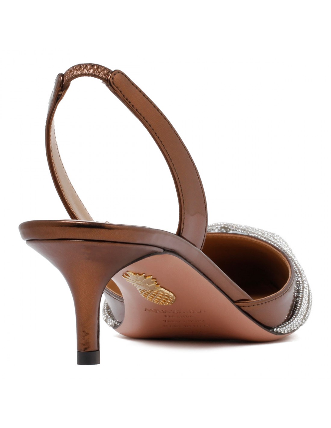 Bronze leather Gatsby slingback pumps from Aquazzura featuring crystal embellishment, pointed toe, 50 slim heel, slingback strap with elastic insert, padded leather insole and leather outsole with iconic pineapple logo.