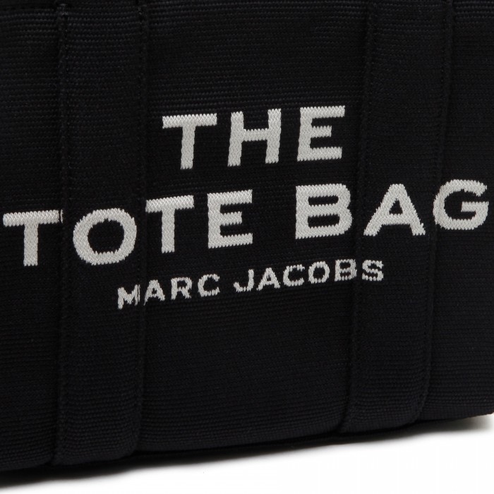 Black canvas The Jacquard small tote bag from Marc Jacobs featuring contrasting jacquard trims and logo, small logo patch, zip fastening along top, detachable and adjustable webbing shoulder strap, canvas top handles.