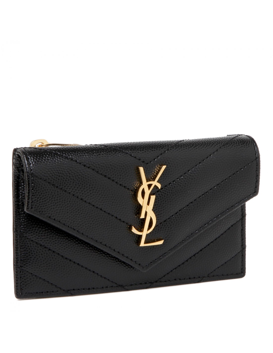 Black grain de poudre embossed leather Cassandre matelasse fragments card case from Saint Laurent featuring front flap made with interlocking YSL logo, card slots on the back, zipped coin pocket and snap-button closure.