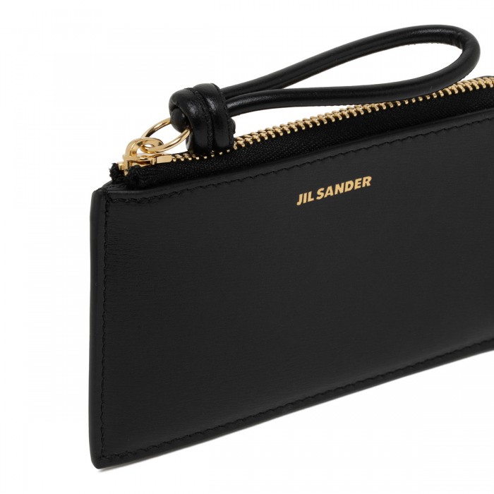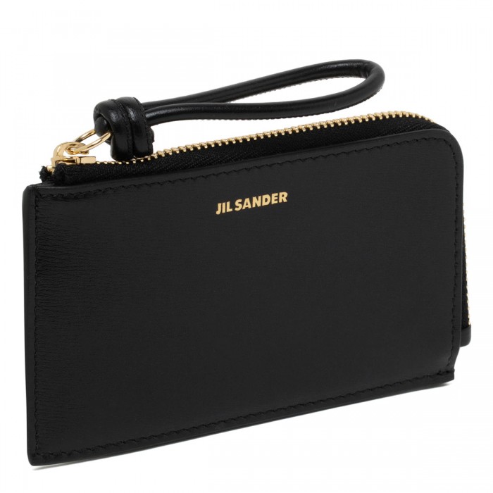 Black leather Giro small coin purse from Jil Sander featuring hand-knotted wrist strap, embossed Jil Sander logo, zip around fastening, four external card slots.