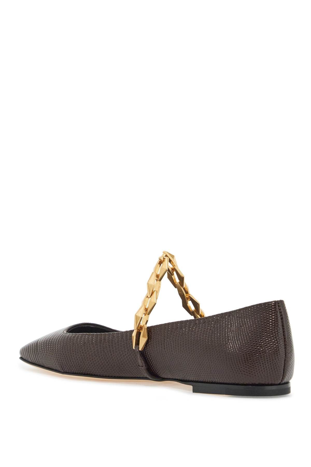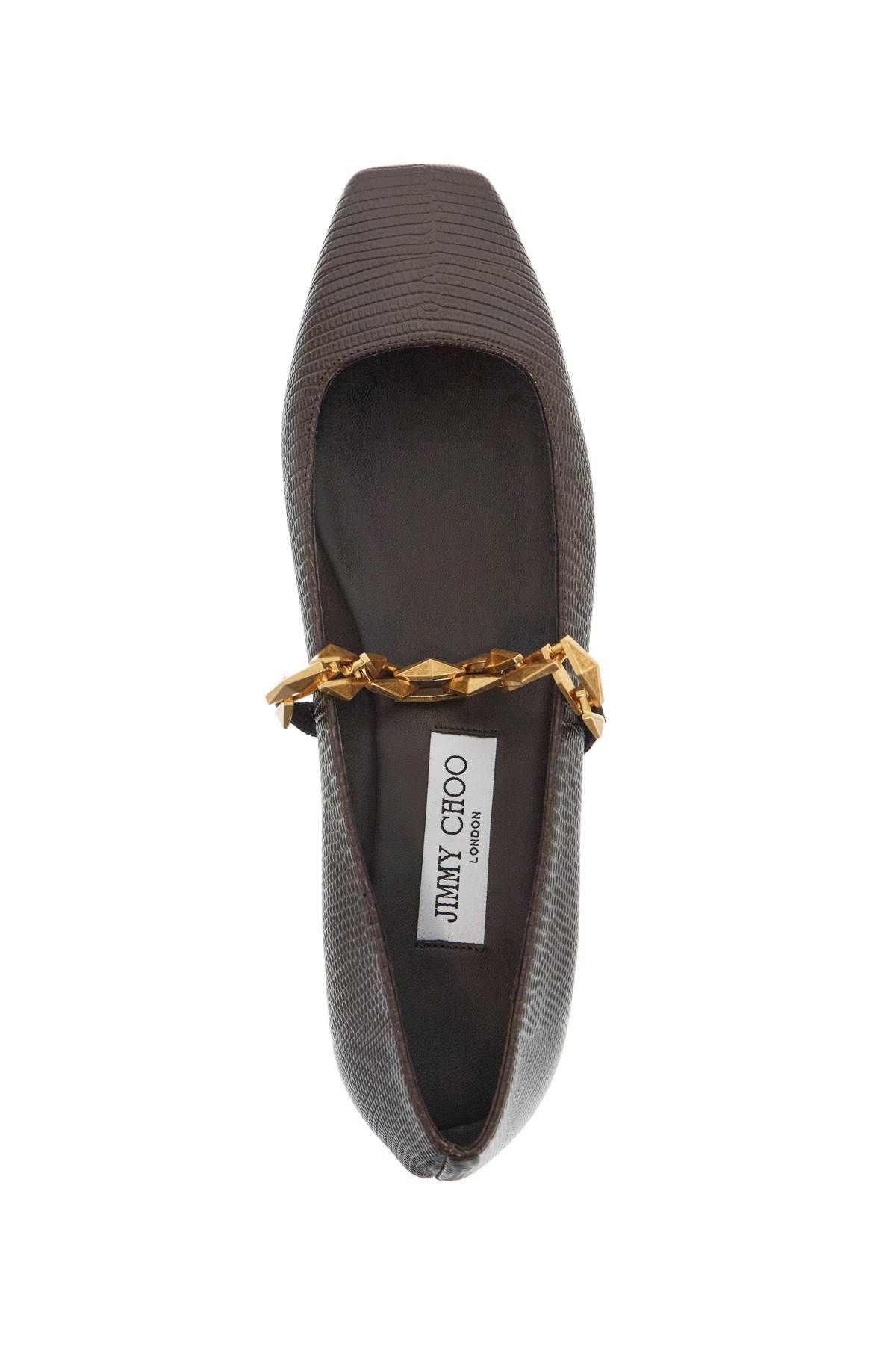 The Tilda ballerinas by Jimmy Choo are made of embossed lizard leather and embellished with a faceted chain applied on the vamp