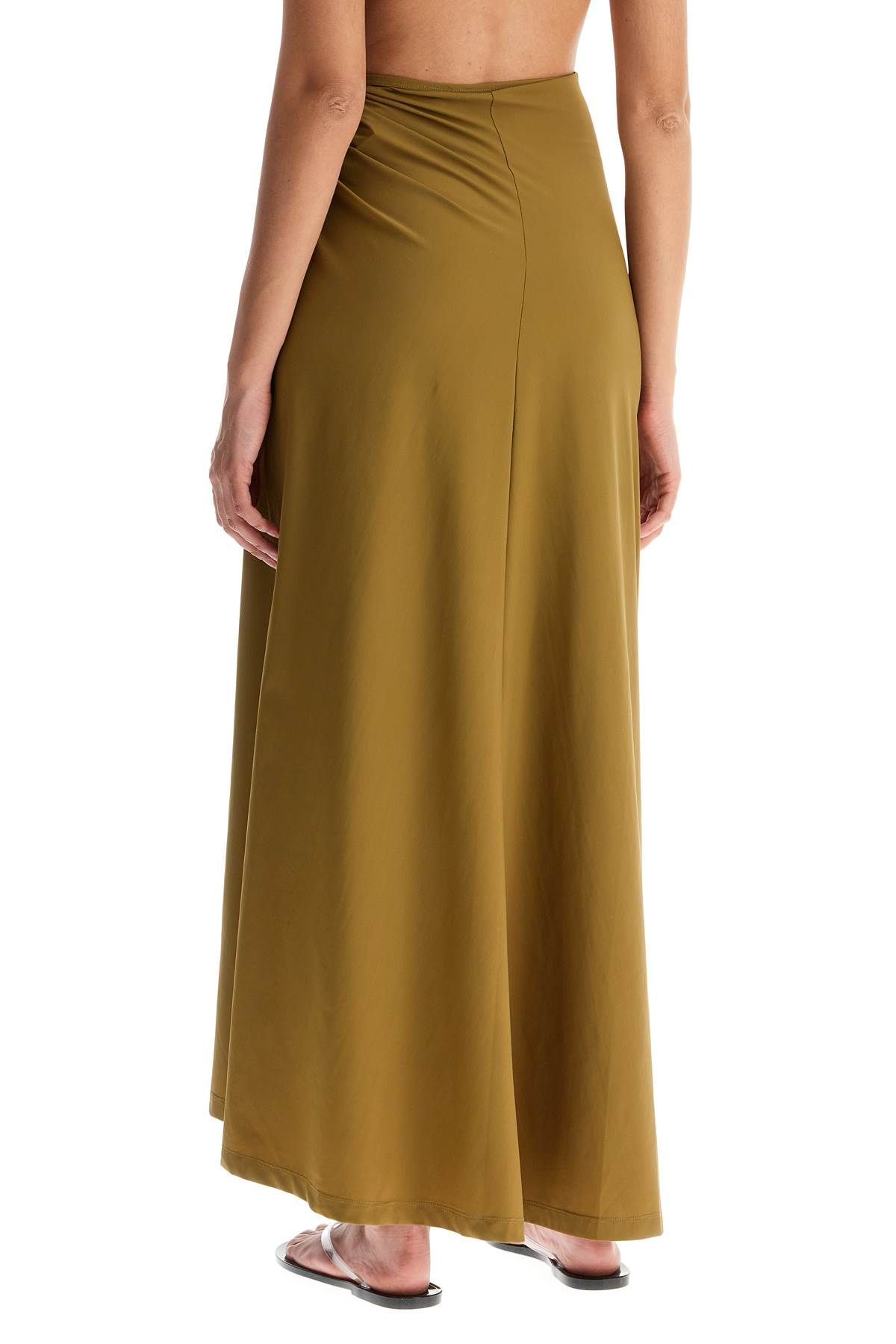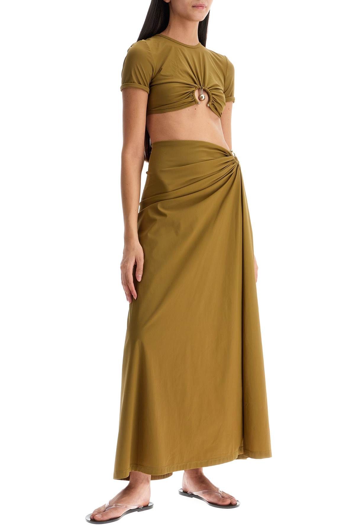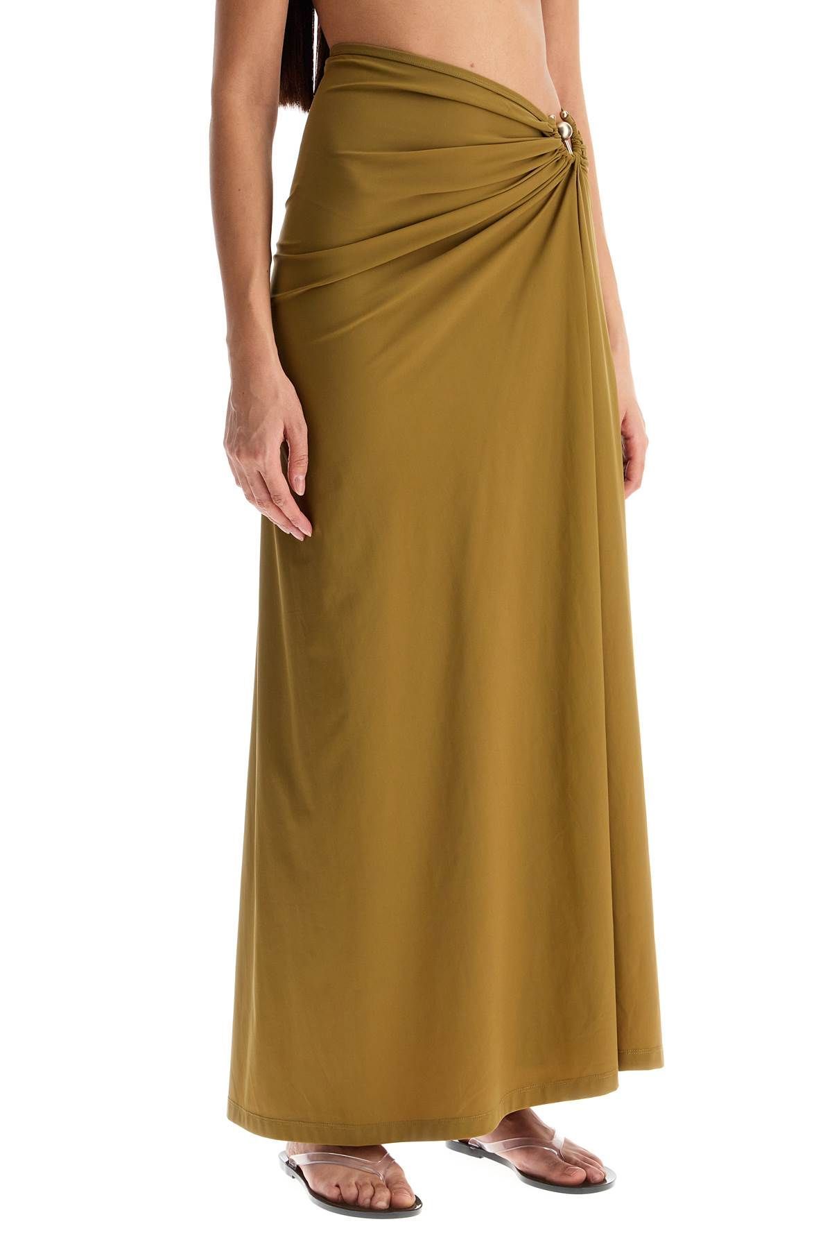 The Christopher Esber long skirt is made of lycra and features a side ruching with the classic gold brass element and a large slit
