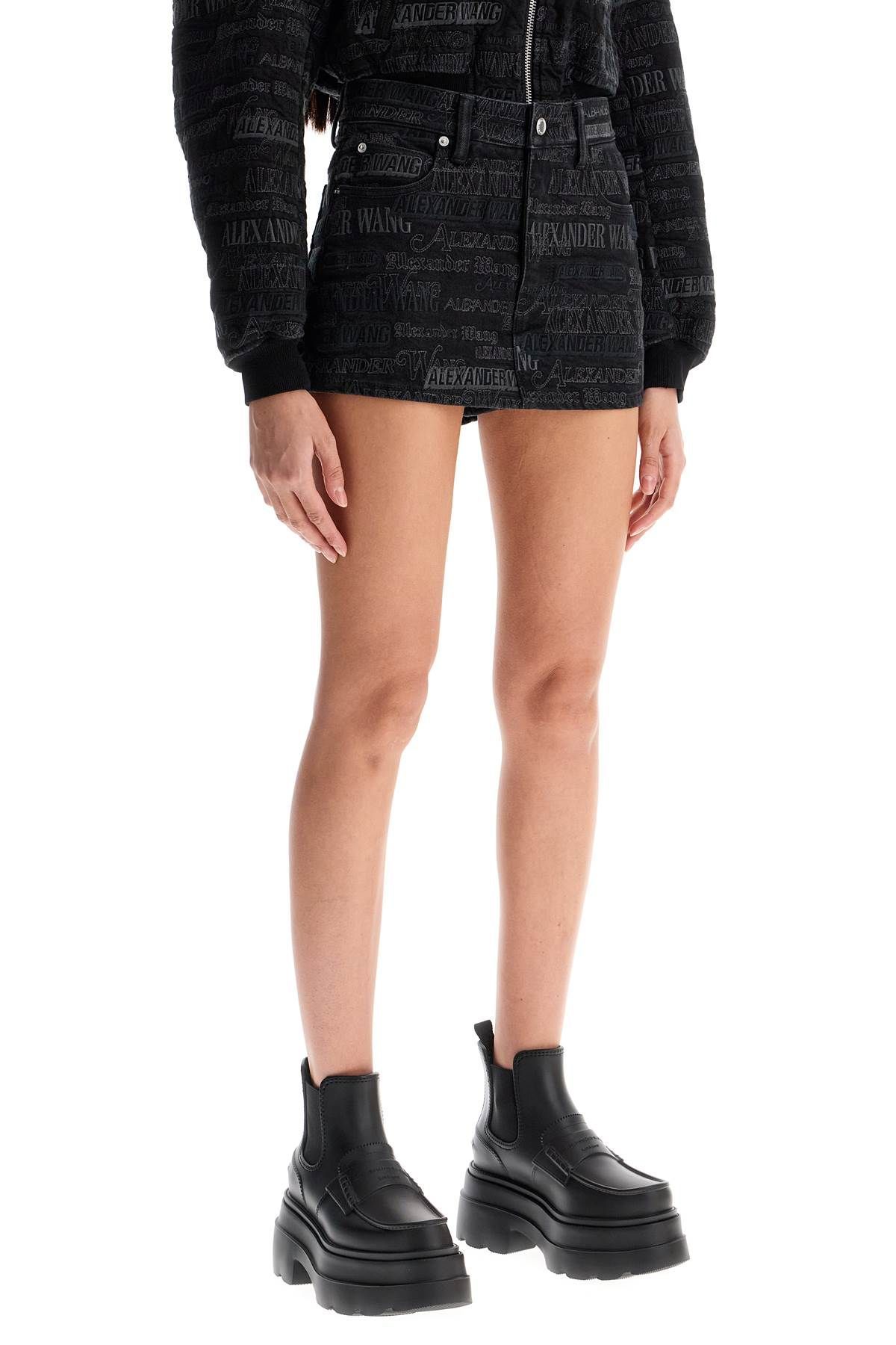 "Introducing the Alexander Wang mini skort, crafted from stretch cotton denim and adorned with all-over embroidery in various fonts inspired by newspaper graphics