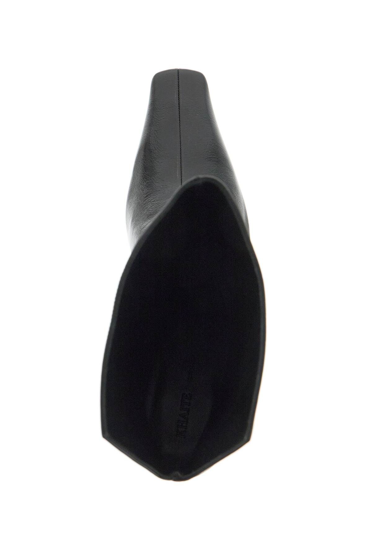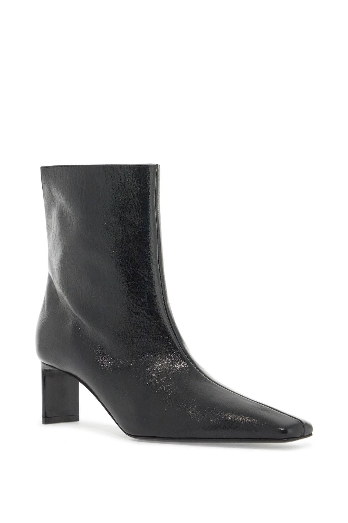 The Ona ankle boots by Khaite are made of glossy leather with a tapered and squared toe, V-cut at the back, and flat heel