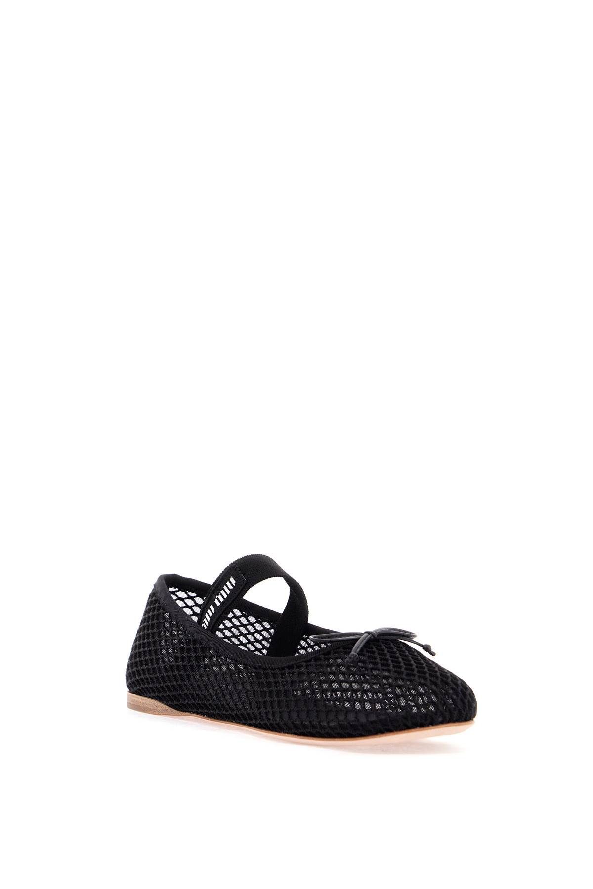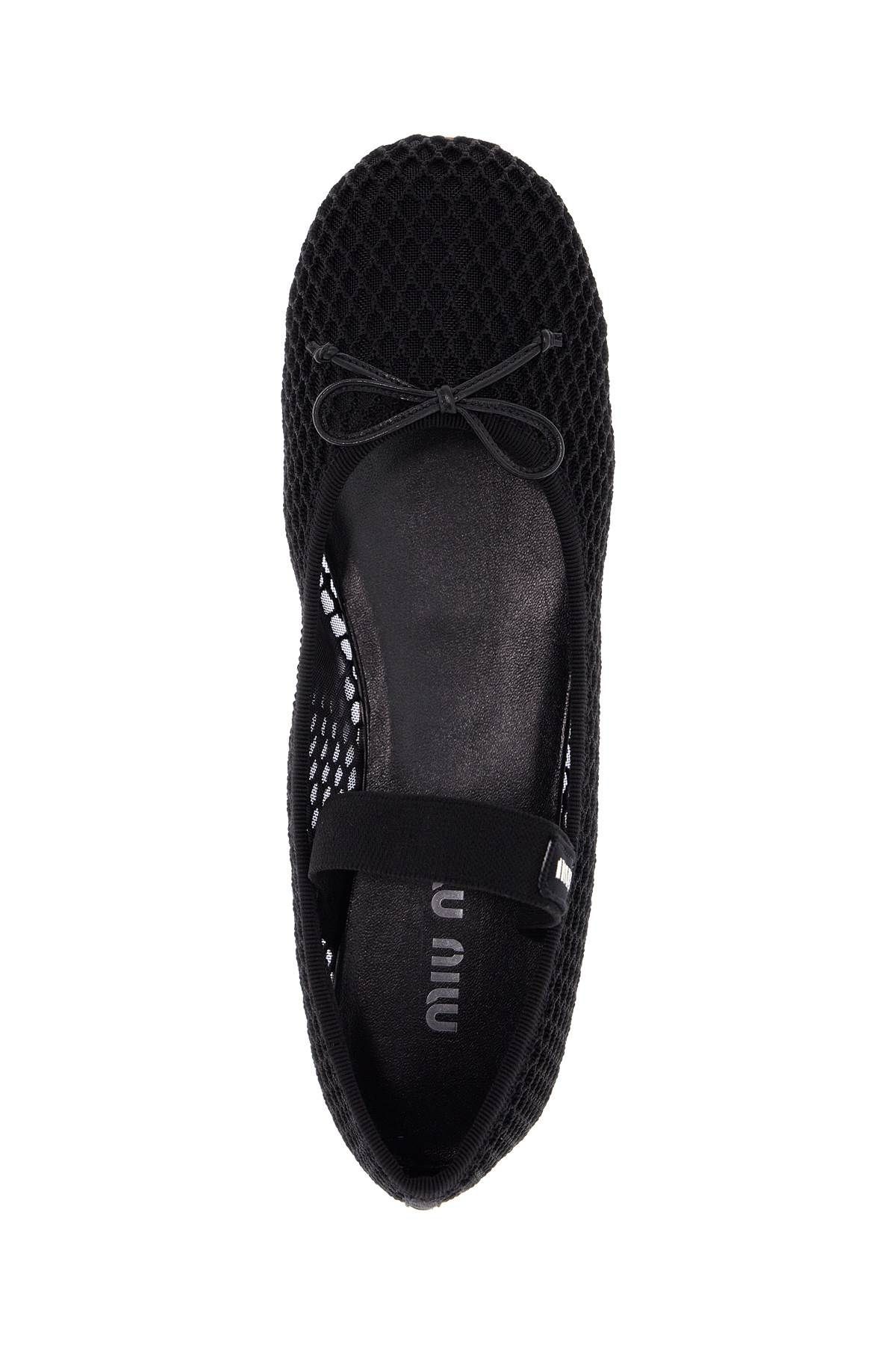 These Miu Miu ballerina flats are made of technical fabric mesh and adorned with a leather bow on the toe, an elastic strap with logo patch, and grosgrain trim