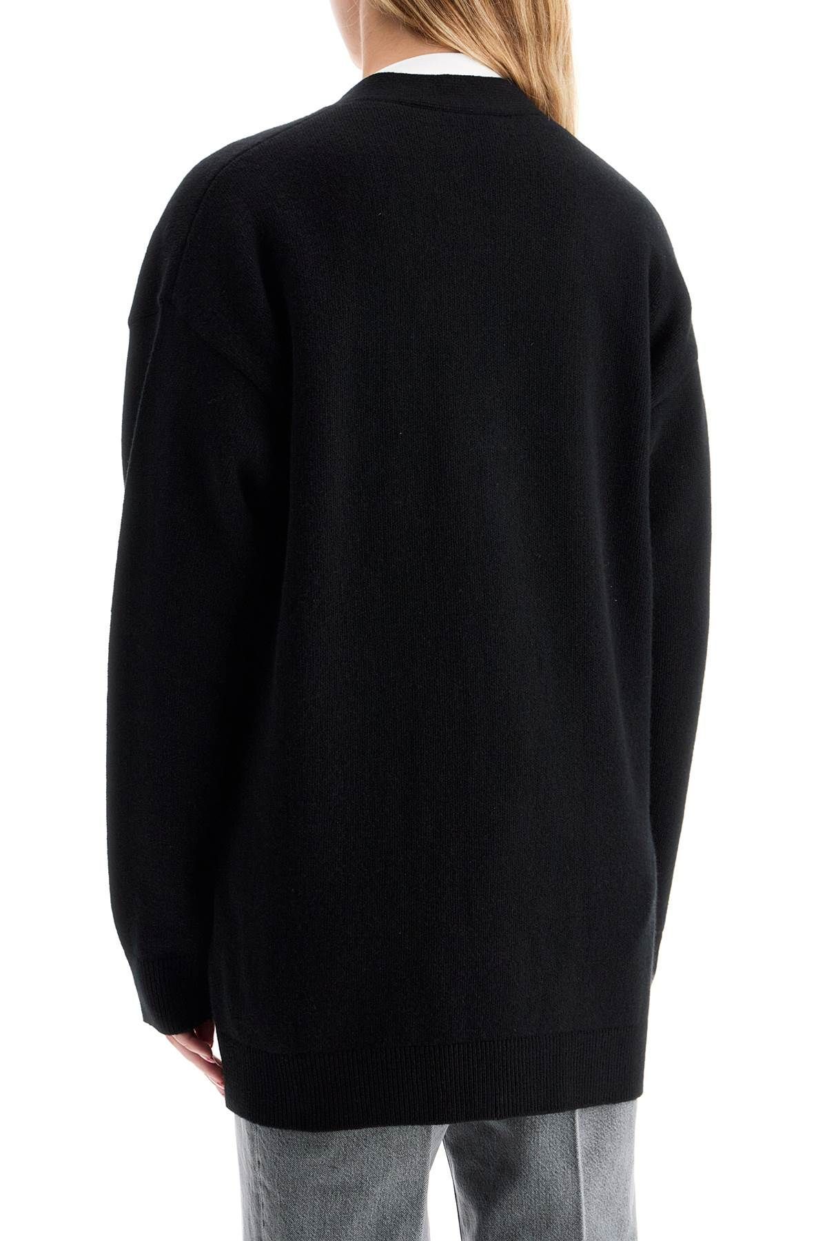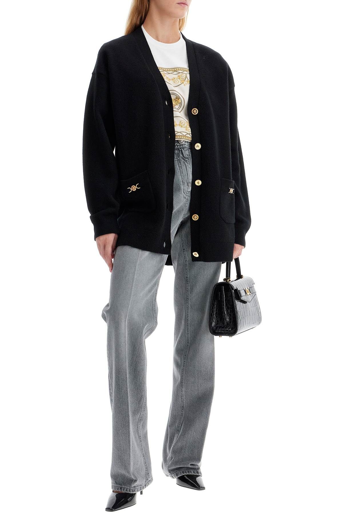 Versace's boxy fit cardigan, made of a blend of wool and cashmere, features Medusa '95 decorations on the pockets