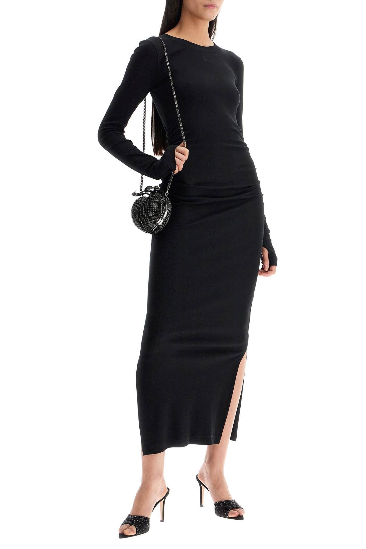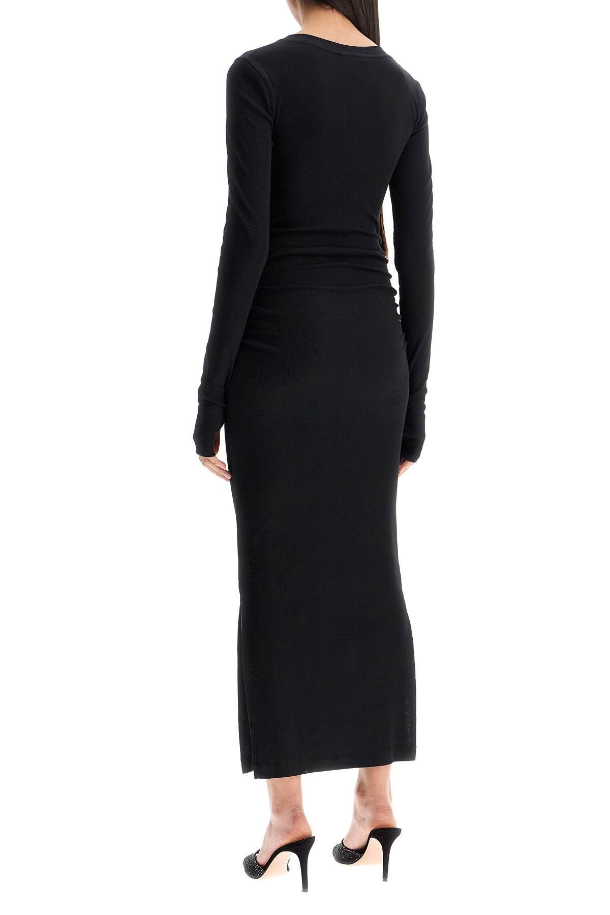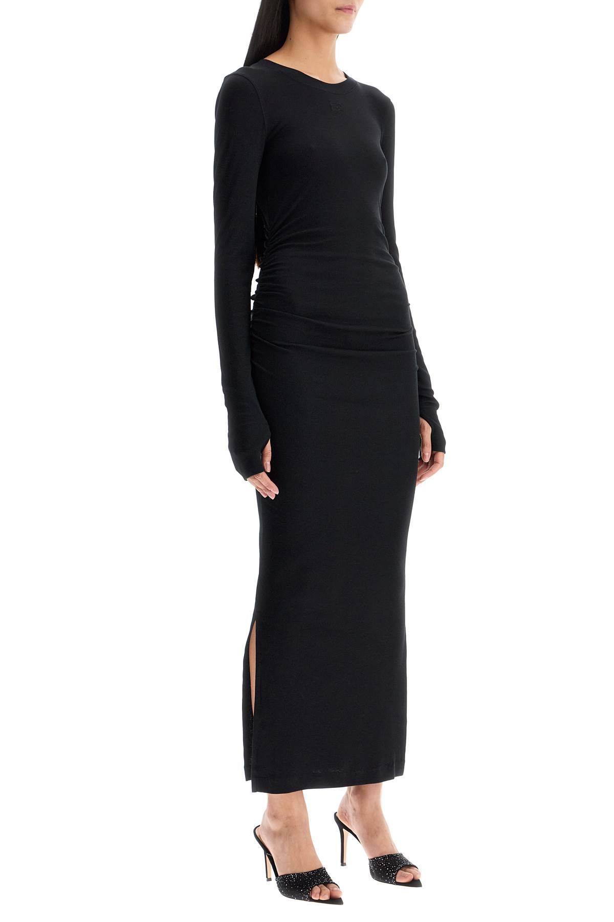 This Ganni long dress has a fitted silhouette with ruching and side slits