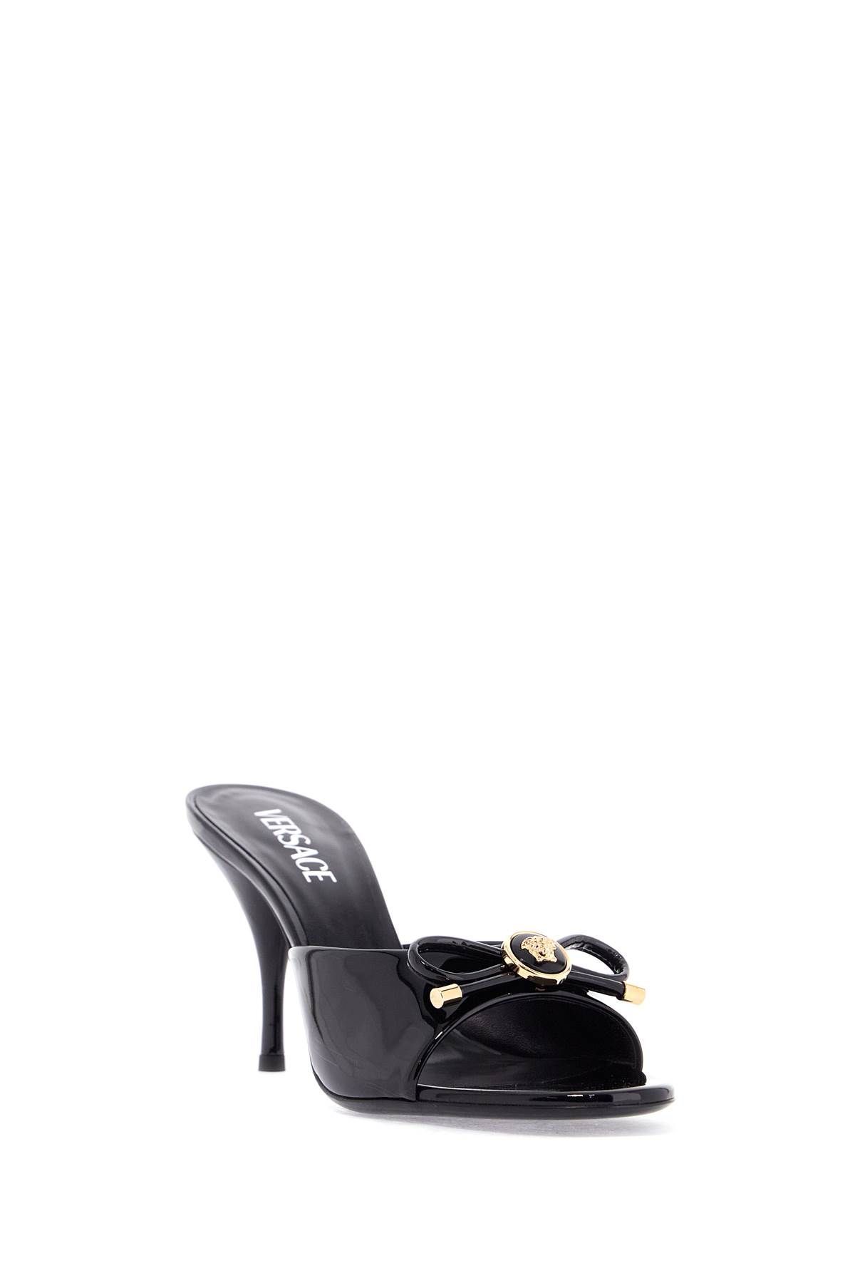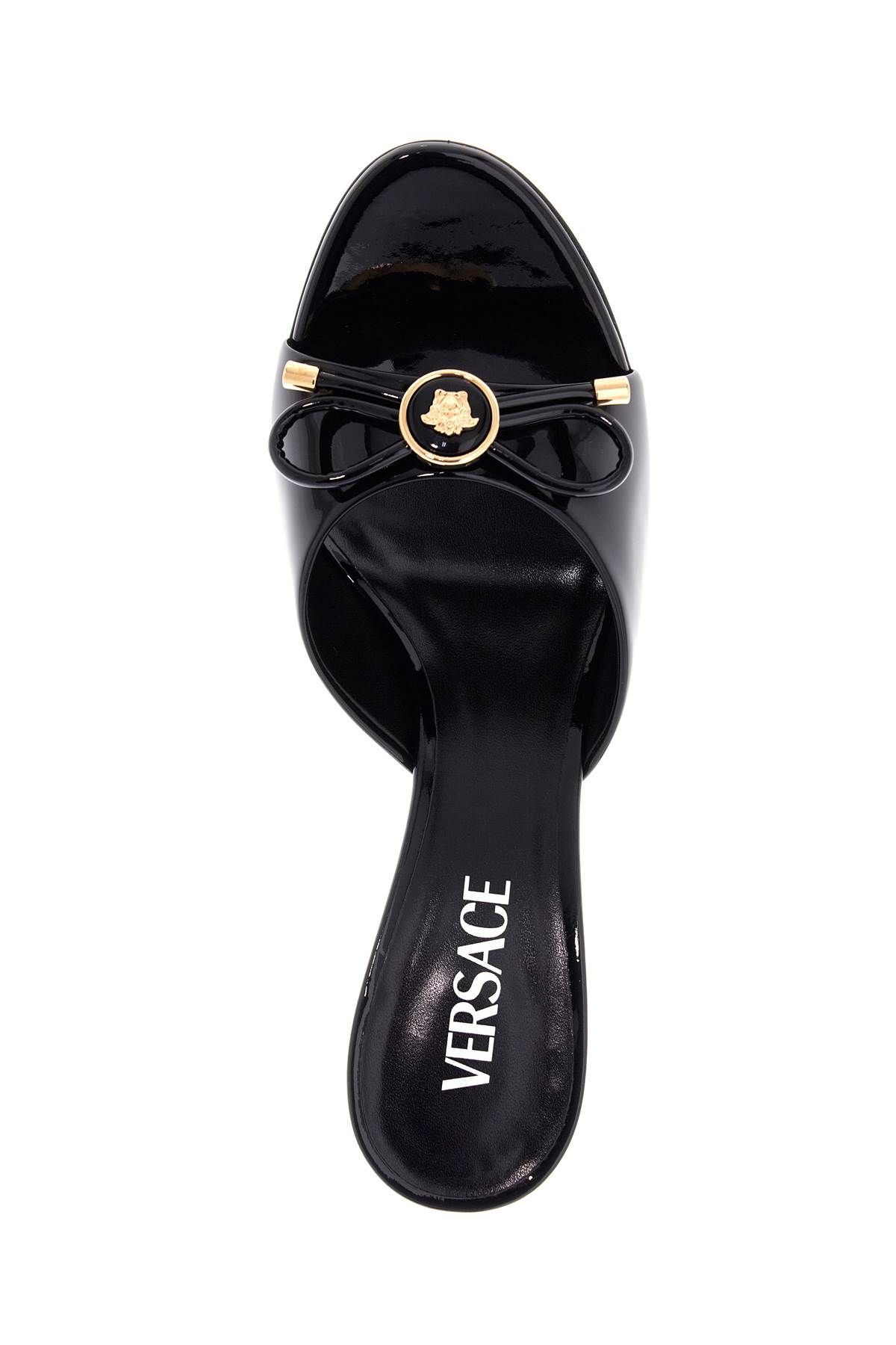 Versace's Opera Bow Mules are made of patent leather and embellished with a matching bow and the iconic Medusa element in enameled metal