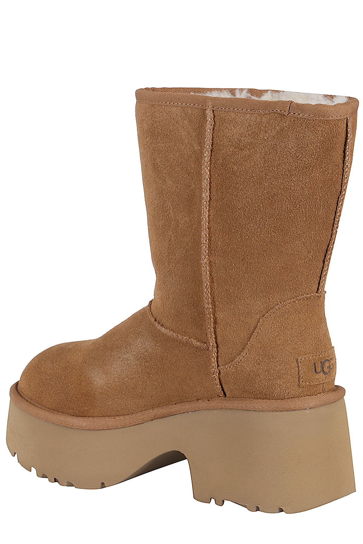 - New Heights Classic Short Boot - Ugg - camel color - suede upper - regenerated wool and lyocell lining - EVA sole - 7cm platform height - embossed heat-stamped logo