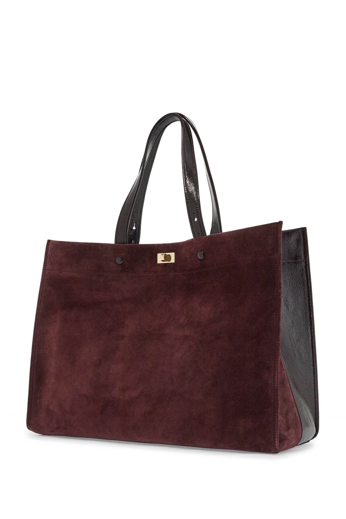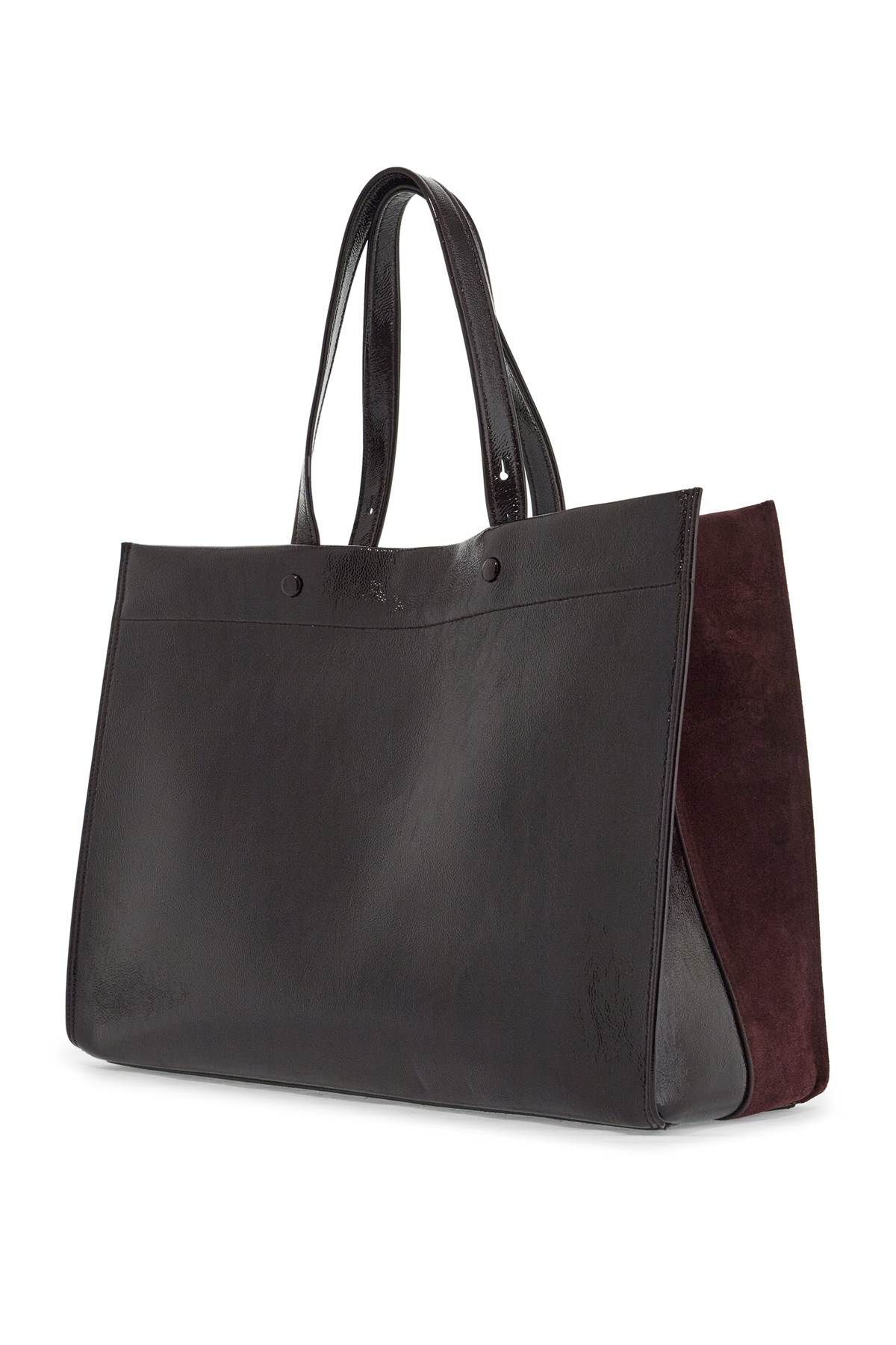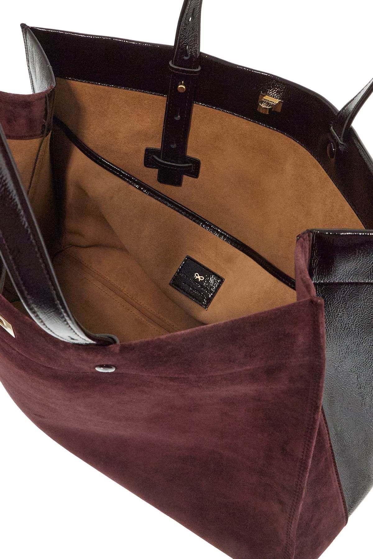 The Mortimer tote bag by Anya Hindmarch features a unique design with half suede leather and half patent leather