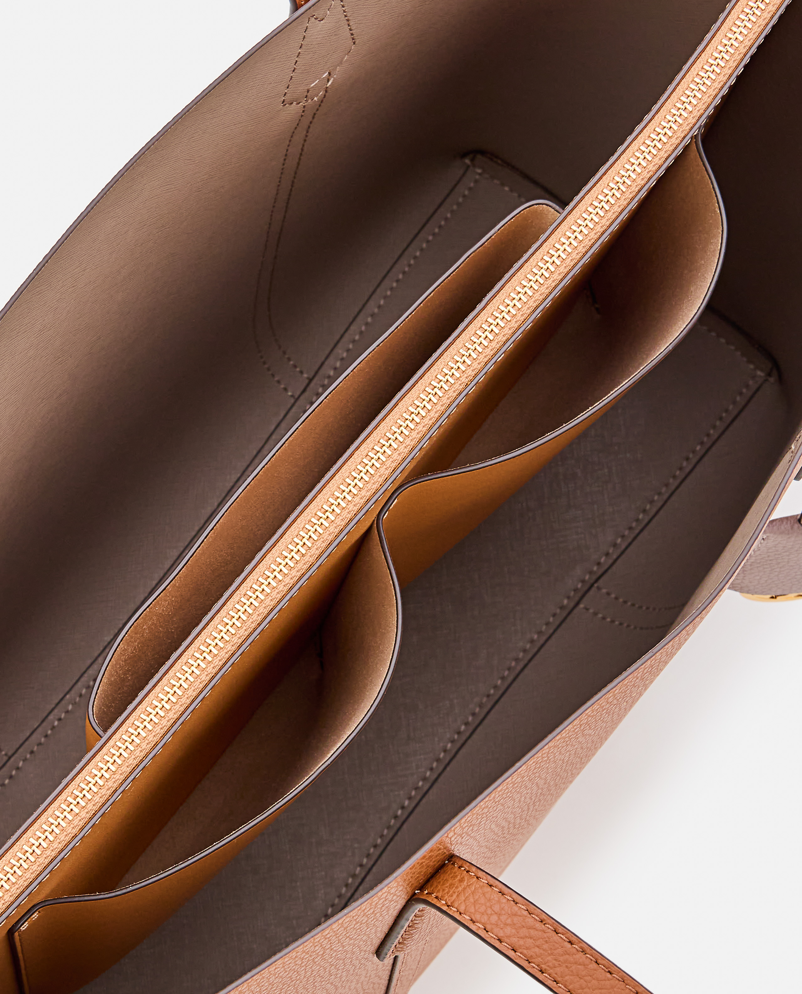 Long handles that fit comfortably on the shouldersCentral zipped pocketProtective feetRemovable contrasting pendant