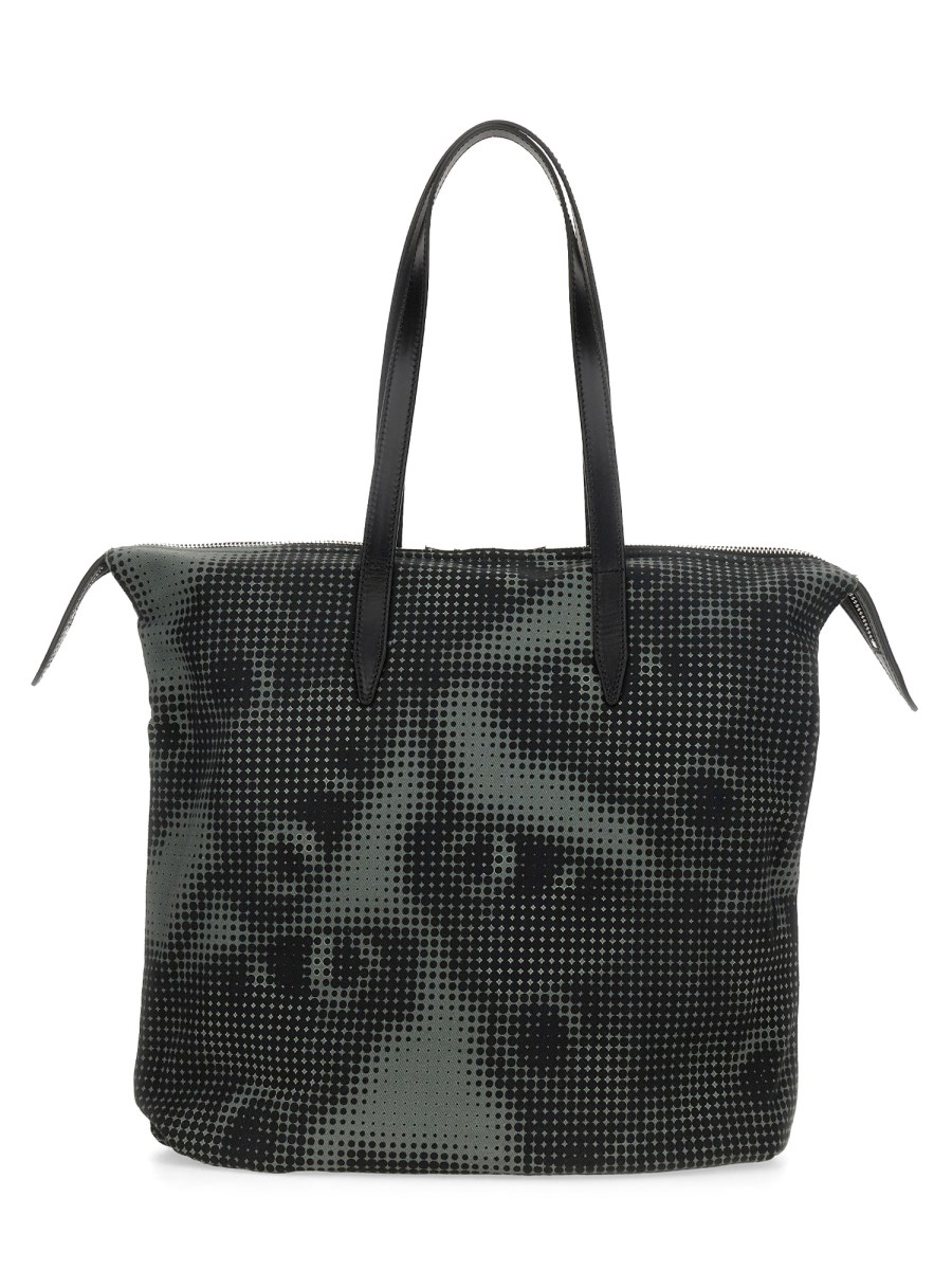 프린트 코튼 데님 토트 백 위드 레더 디테일