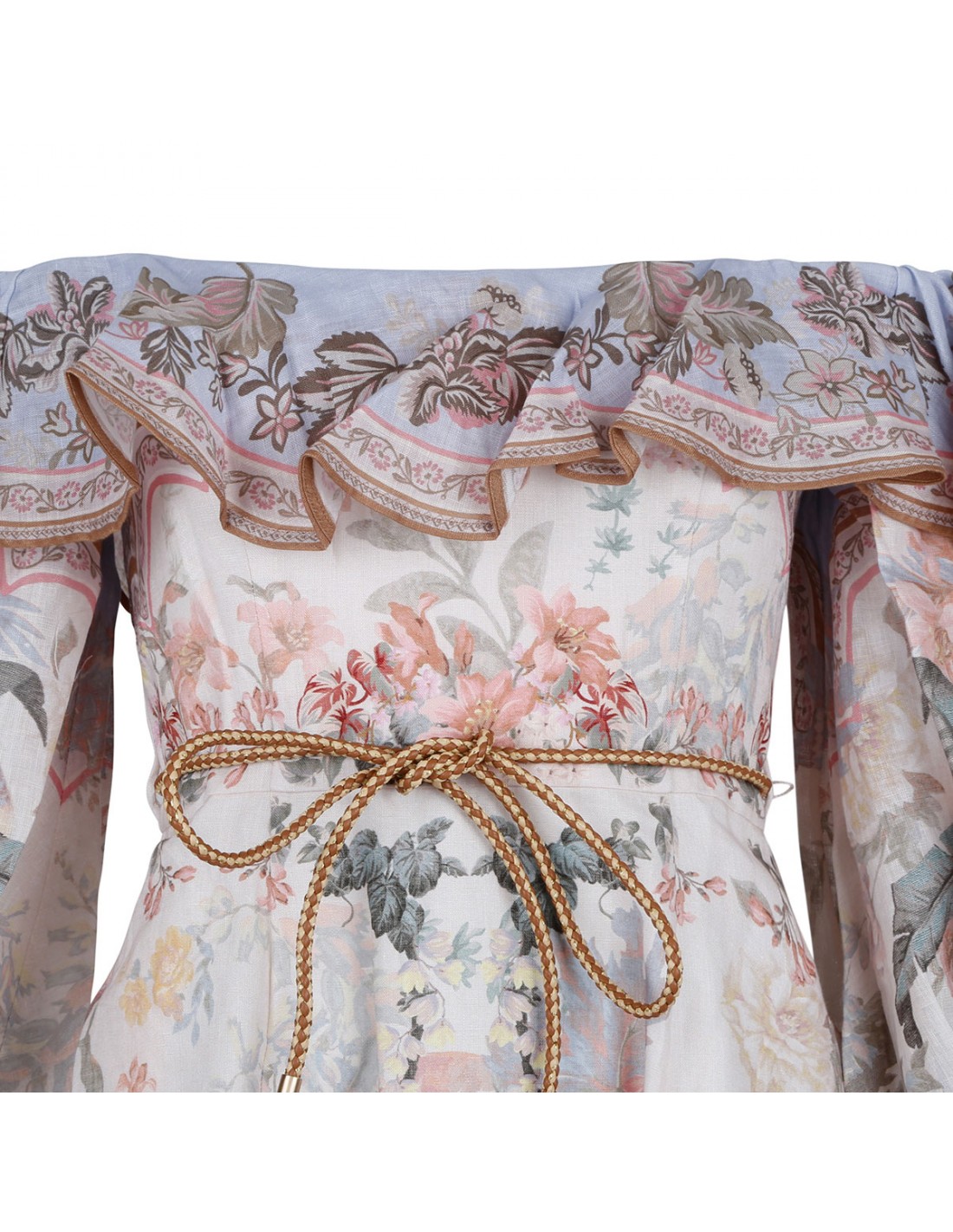 Blue linen Wylie off-shoulder midi dress from Zimmermann featuring floral motif printed allover, off-shoulder neckline, bodice ruffles, long sleeves with elastic cuffs, side pockets, detachable leather belt, shirred back panel, invisible zip closure at centre back.?