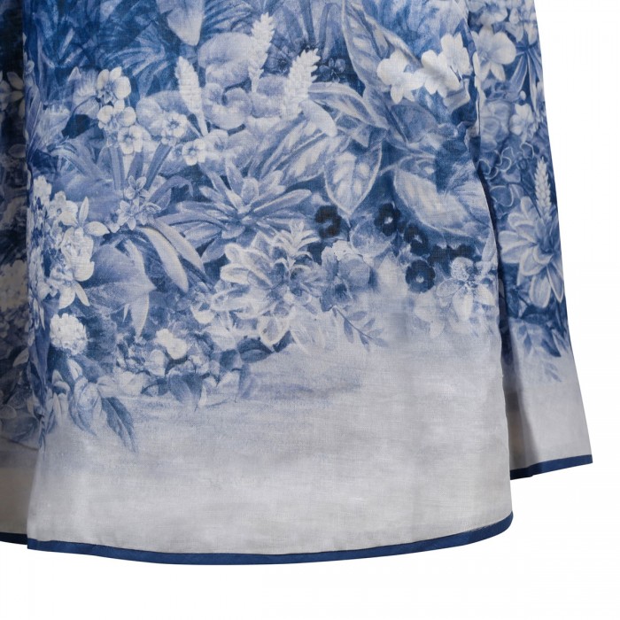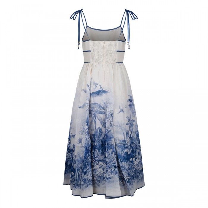 Blue linen Wylie picnic dress from Zimmermann featuring floral motif, midi length, fitted bustier with gathering, shirred back bust, self tie shoulder straps, side pockets, flat piping inserts, concealed zip at centre back.