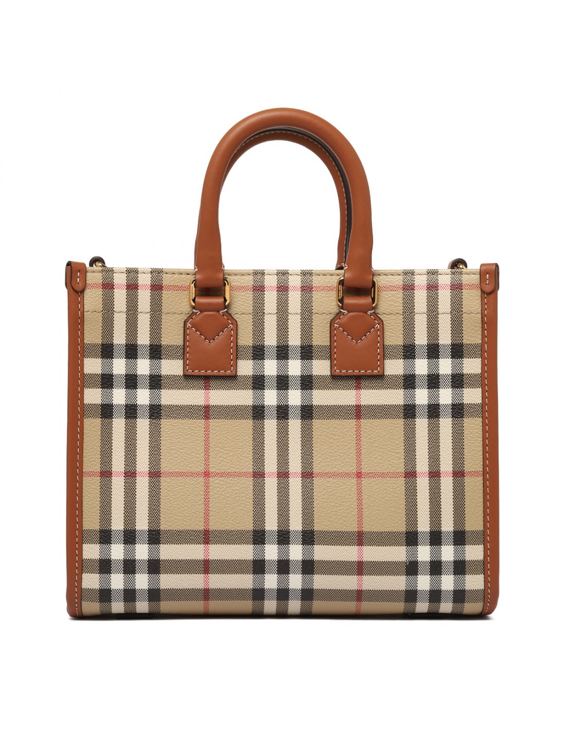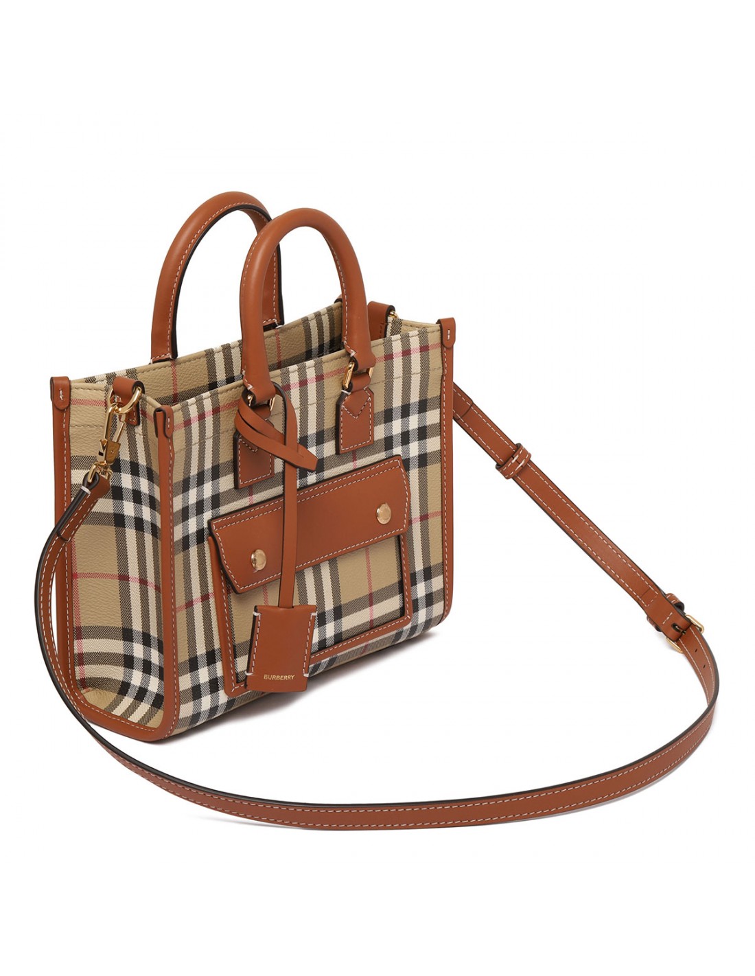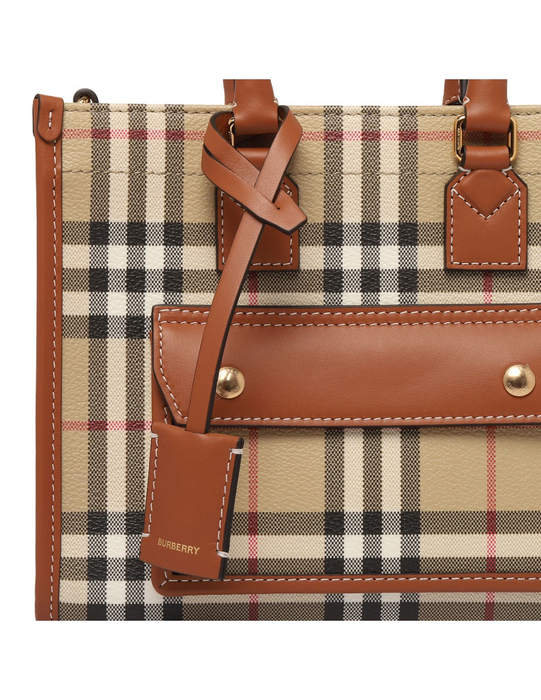 Check coated cotton blend Freya mini tote bag from Burberry featuring brown leather trims, magnetic front pocket, leather top handles, detachable and adjustable leather strap, press-stud fastening, hand-painted edges, polished metal hardware, luggage tag with logo, cotton lining and internal slip pocket.