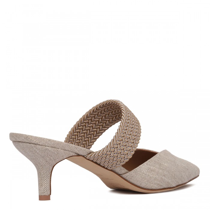 Beige Maisie mule pumps from Malone Souliers featuring linen upper, braided elasticated strap, pointed toe, slip-on style, kitten heel, V-cut vamp, leather lining and sole.