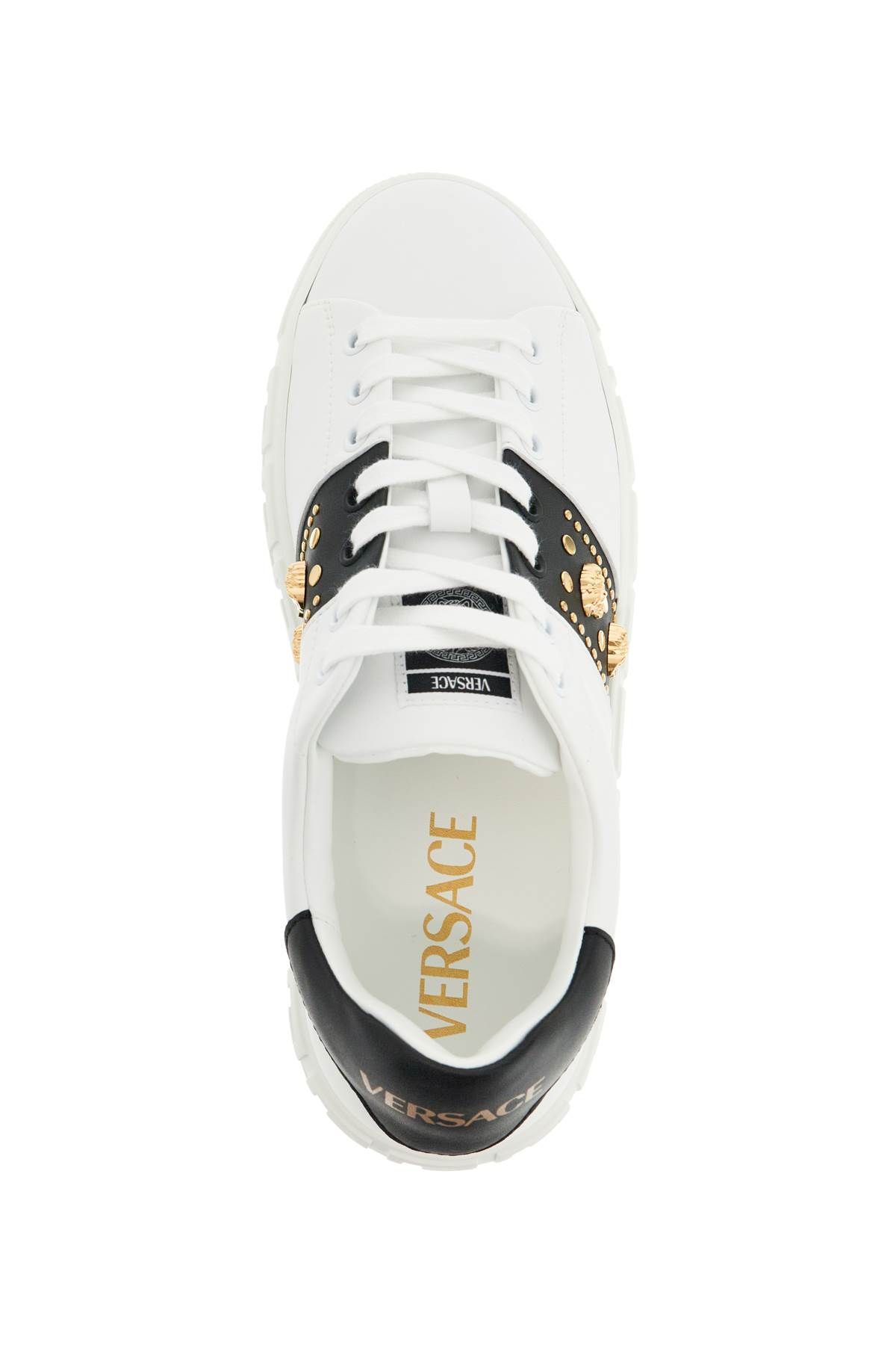 These Versace sneakers are made of eco-leather and adorned with Medusa and gold-finished studs