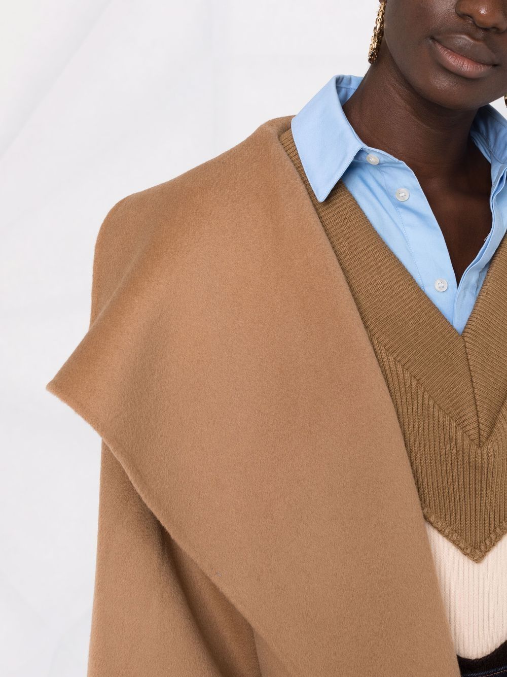 Camel wool-cashmere blend single-breasted wool-blend coat from TOTEME featuring panelled design, slip pockets to the sides, long sleeves, side slits, straight hem, long length and wide lapels.