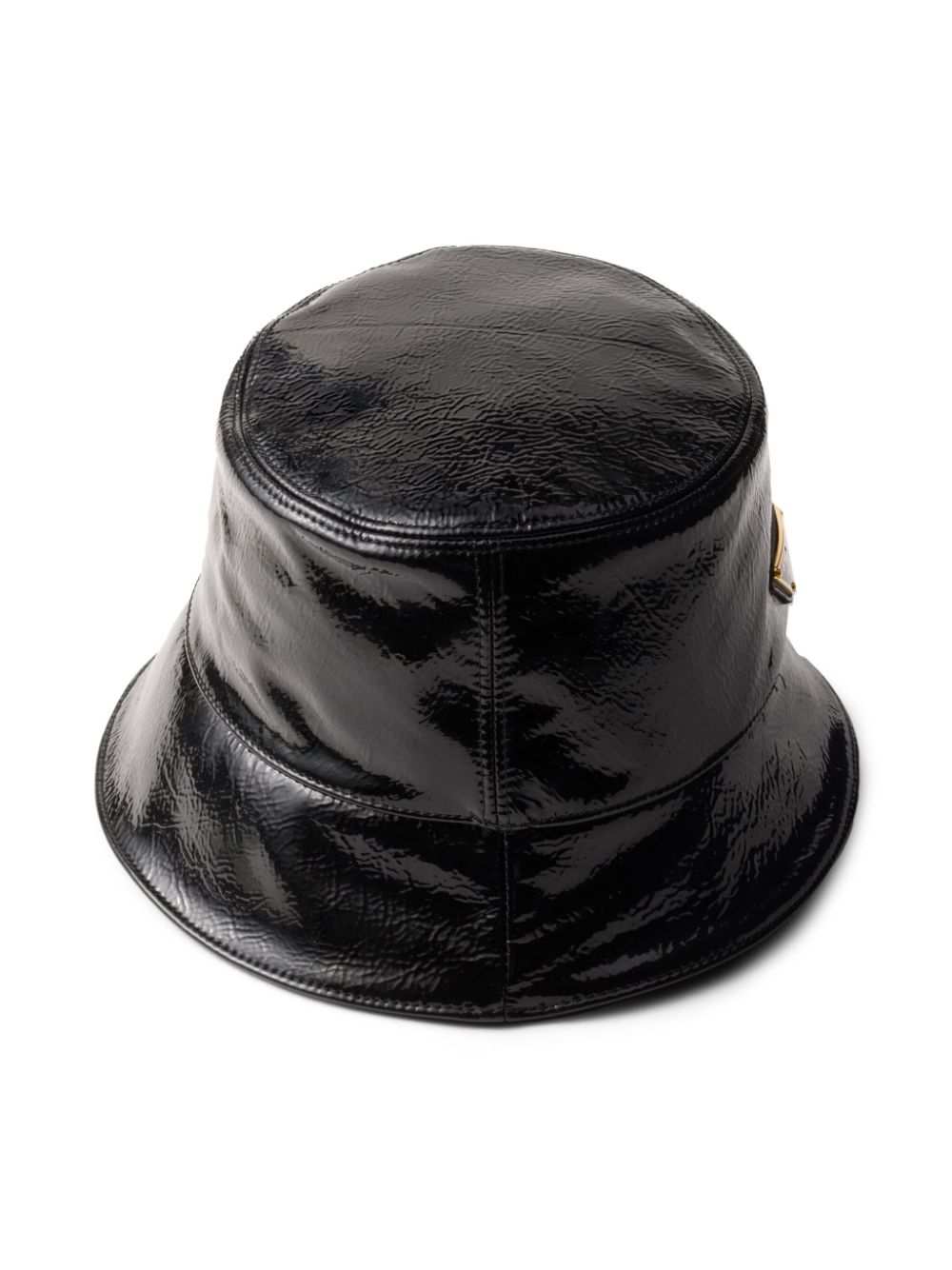 black calf leather patent finish enamel triangle logo flat crown dropped wide brim