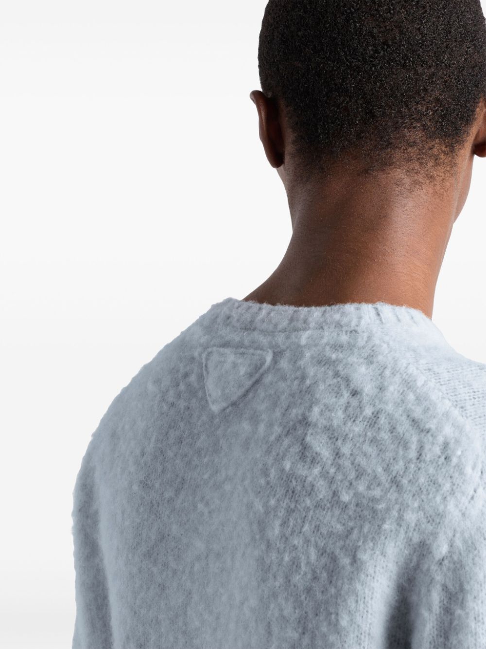 pastel blue wool knitted construction brushed finish crew neck long sleeves ribbed cuffs and hem triangle logo to the rear