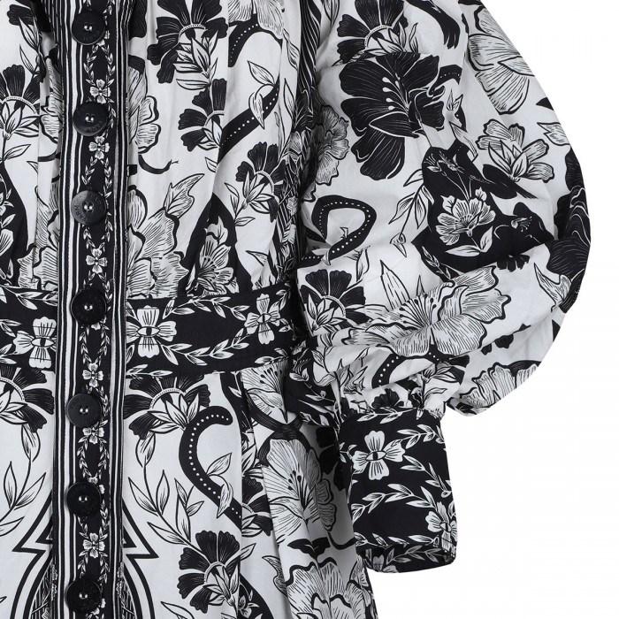 Black and white crepe mini dress from Farm Rio featuring floral and leopards motif, gathered waist and pleated skirt, mock neck, long puff sleeves with buttoned cuffs, hook-and-eye and concealed zip fastening at back.