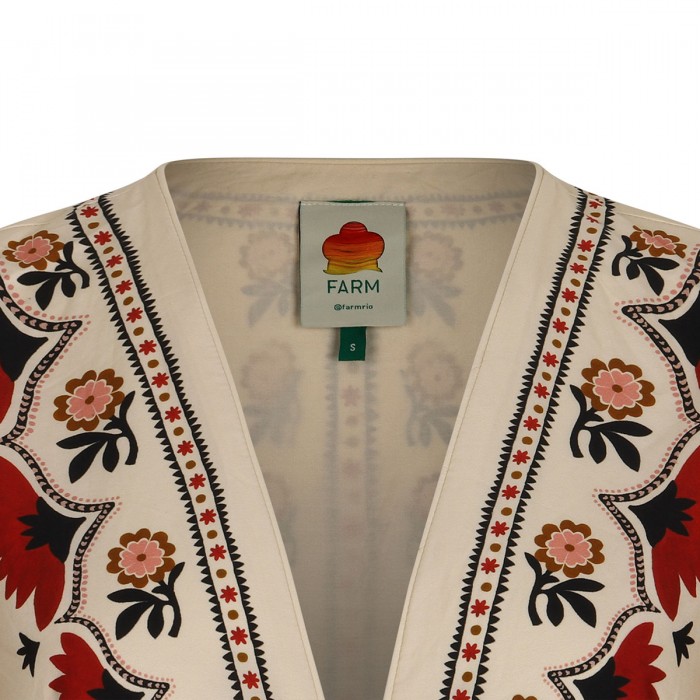 Cream cotton Cashew mandala maxi dress from Farm Rio featuring plunging neckline, floral motif, voluminous long sleeves with fitted cuffs, cinched waist.