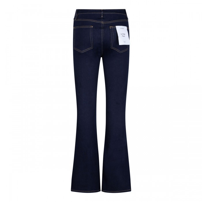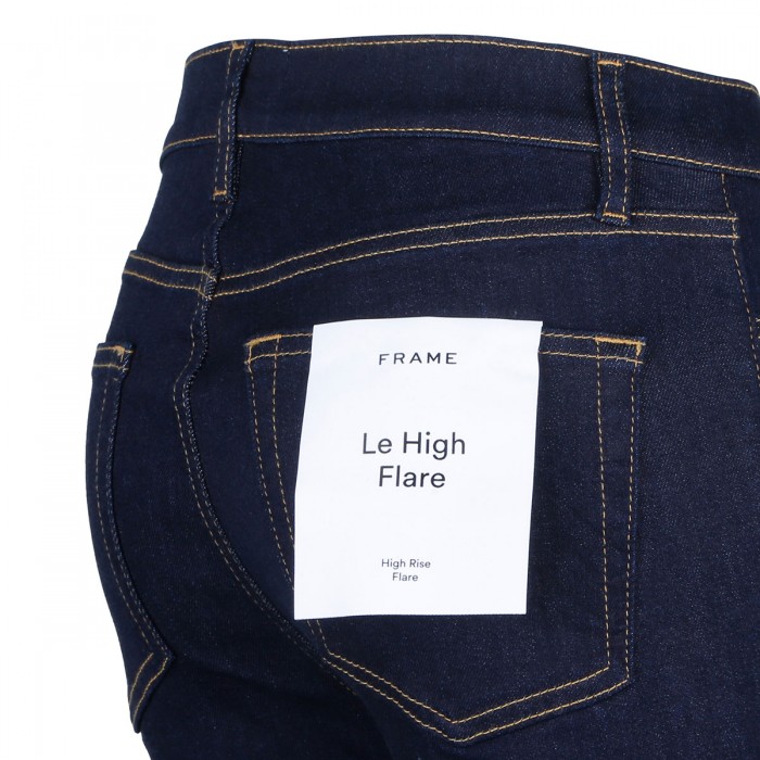 Dark blue stretch denim Le High Flare jeans from Frame featuring high rise, flared leg, long length, high rise, belt loops on the waistband, button closure and zip fly.