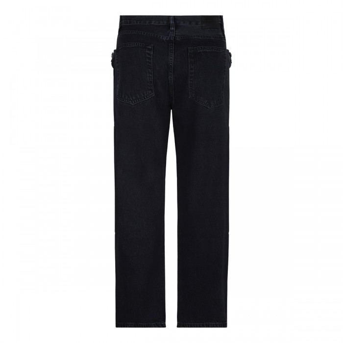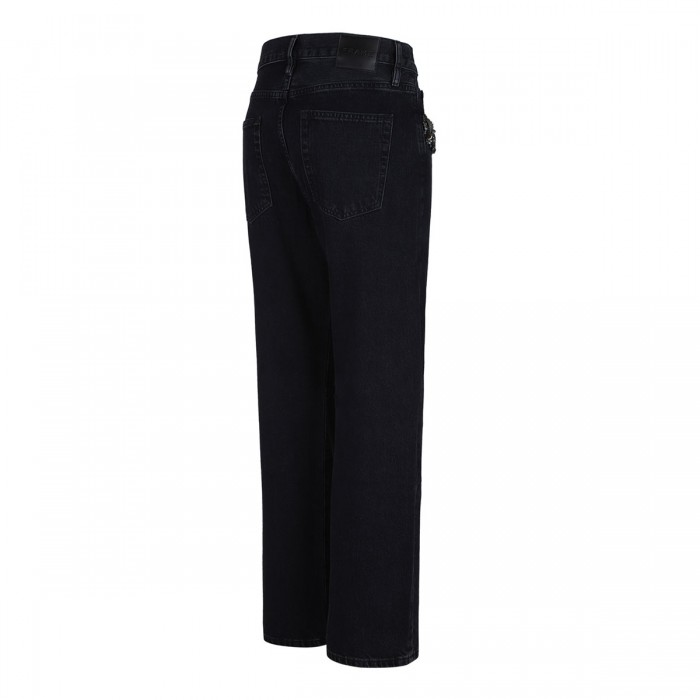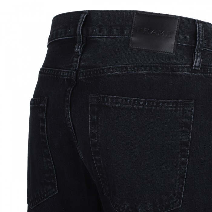 Black premium denim The Atelier Beaded jeans from Frame featuring straight leg, intricate beading on the front pockets, belt loops on the waist, clean ankle-length hem, classic five-pocket style, button closure and zip fly.