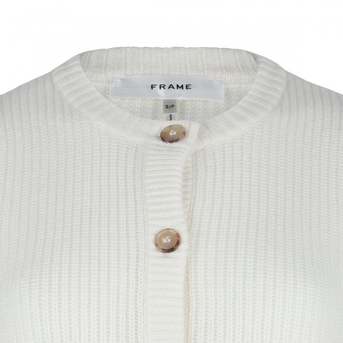 Cream hue ribbed wool-cashmere blend shrunken cardigan from Frame featuring crew collar, button closure, subtle puff short sleeves.