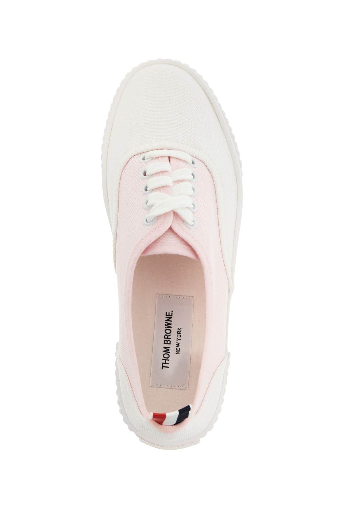 The Funmix Heritage sneakers by Thom Browne are made of color-blocked cotton canvas with flat laces, an unlined interior with a removable insole, rubber sole, and iconic tricolor grosgrain tongue