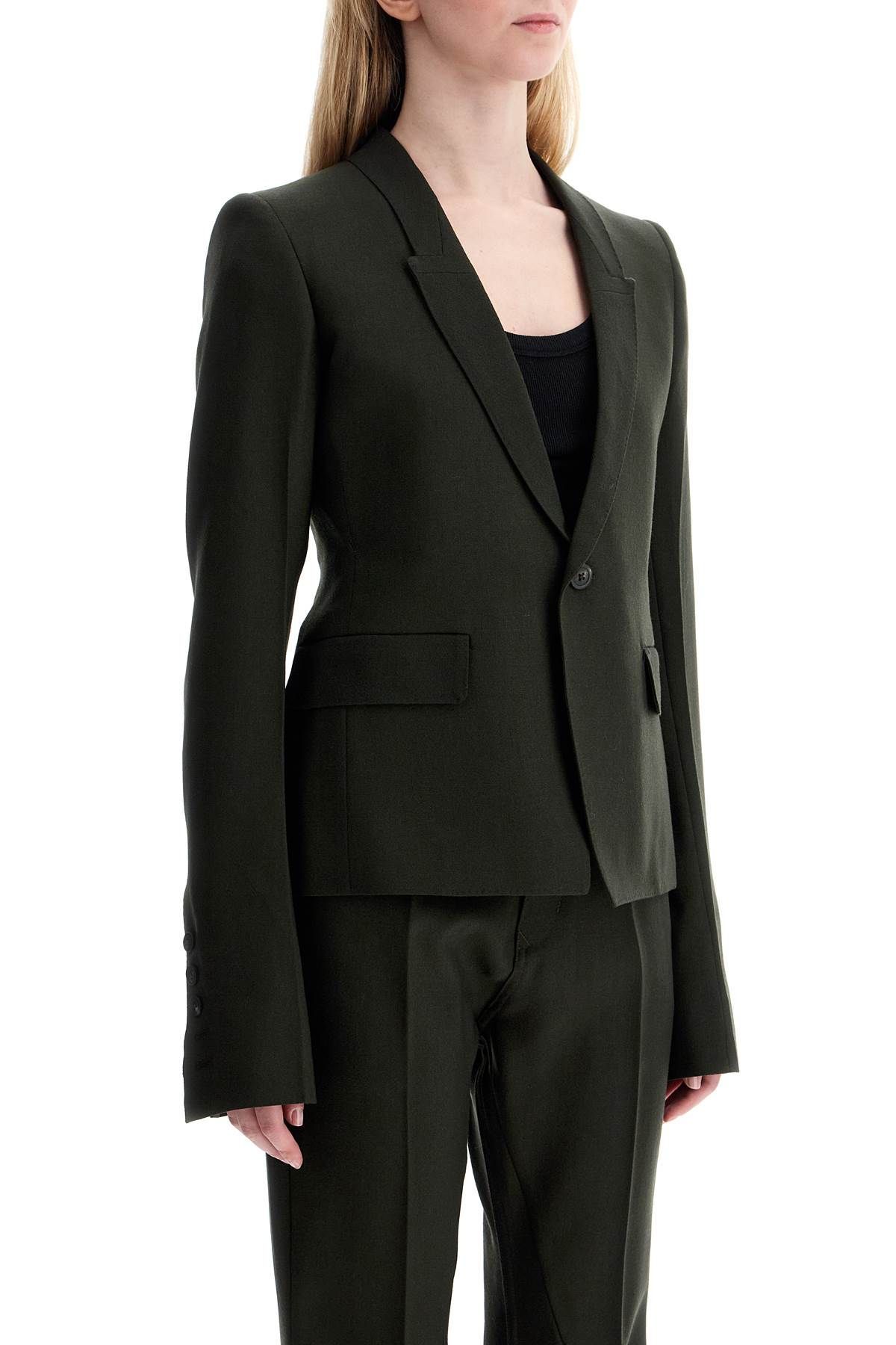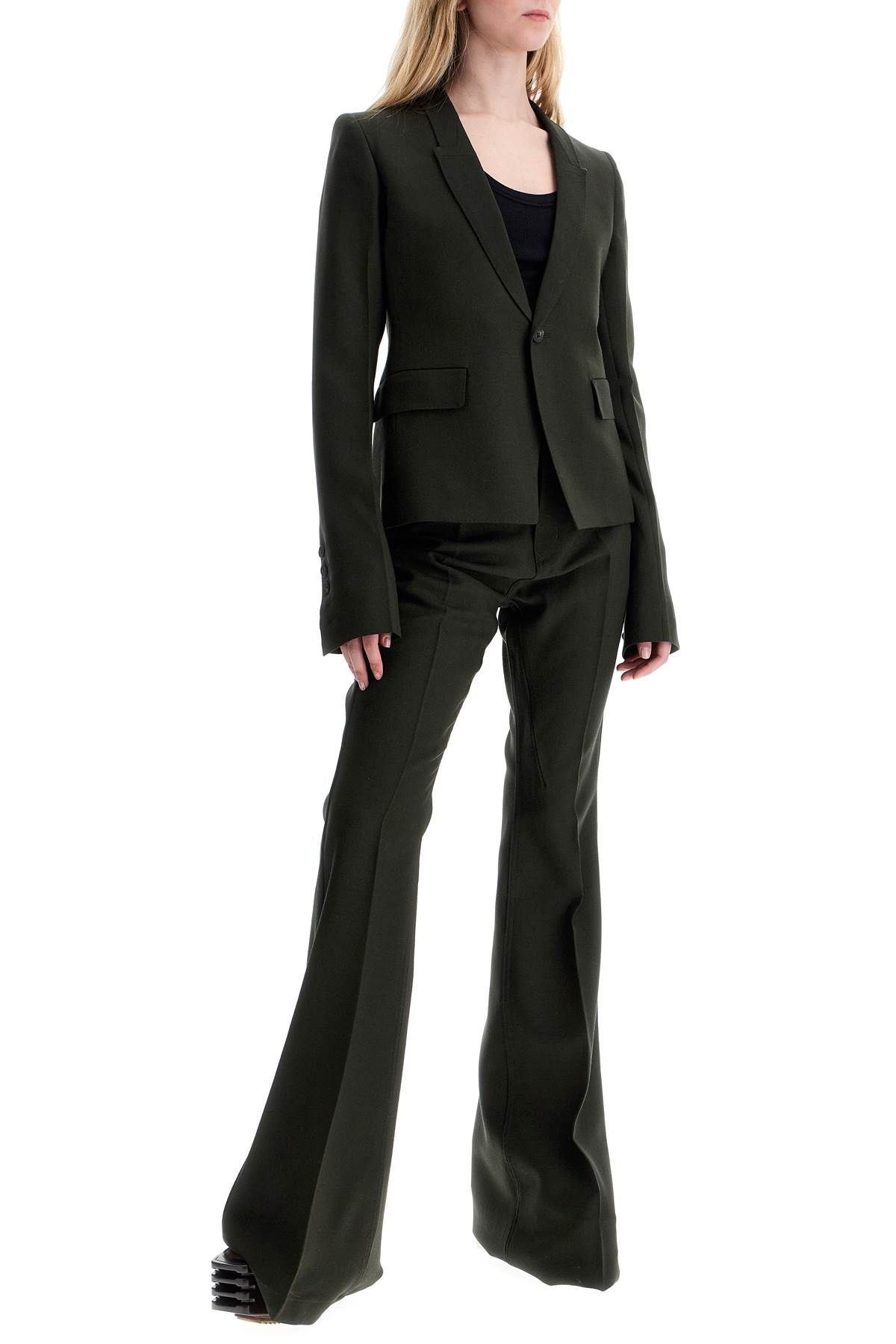 The Rick Owens tailored jacket is characterized by a fitted silhouette with very long and slim sleeves