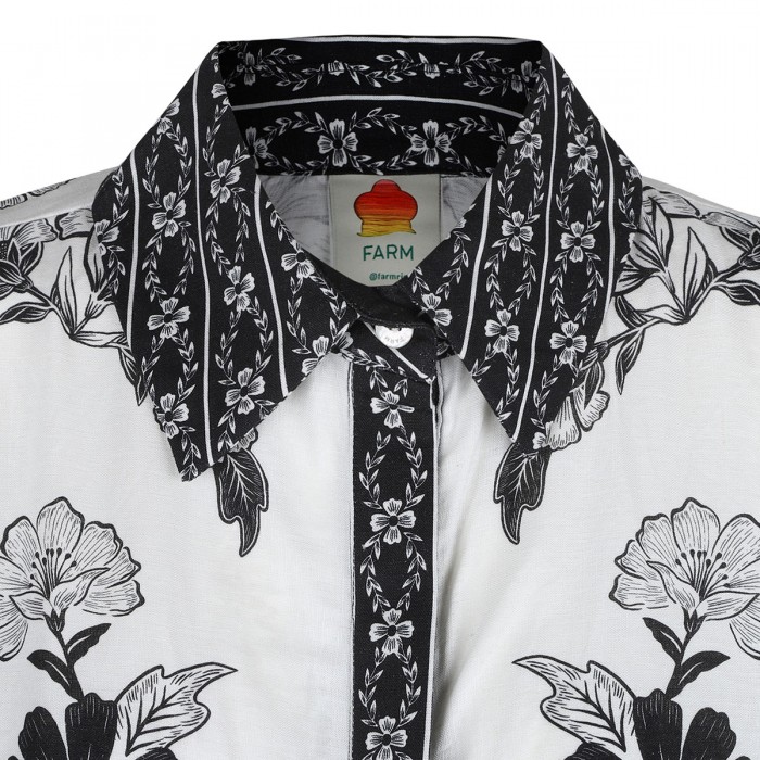 Black and white linen and viscose blend Flower Leopards shirt from Farm Rio featuring classic shirt collar, floral pattern, wide fit, concealed button placket, short sleeves.