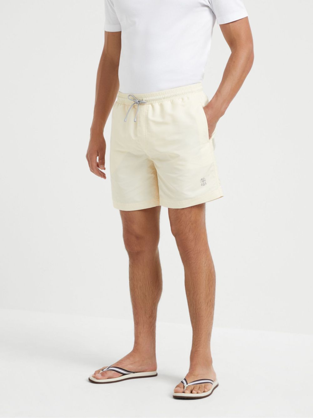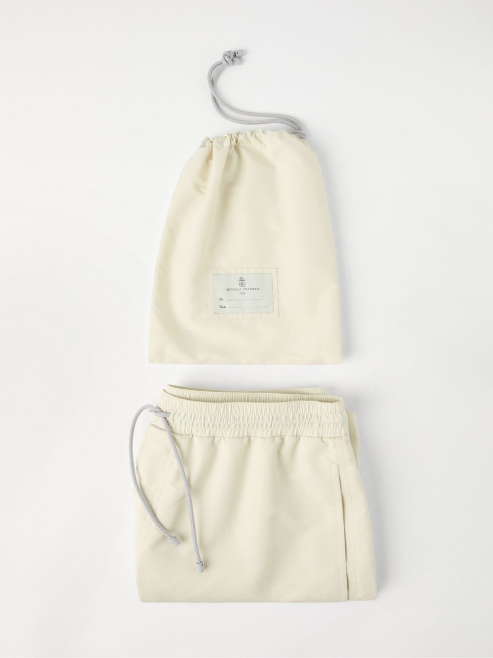ecru elasticated drawstring waistband two side slit pockets rear patch pocket Be mindful to try on swimwear over your own garments.