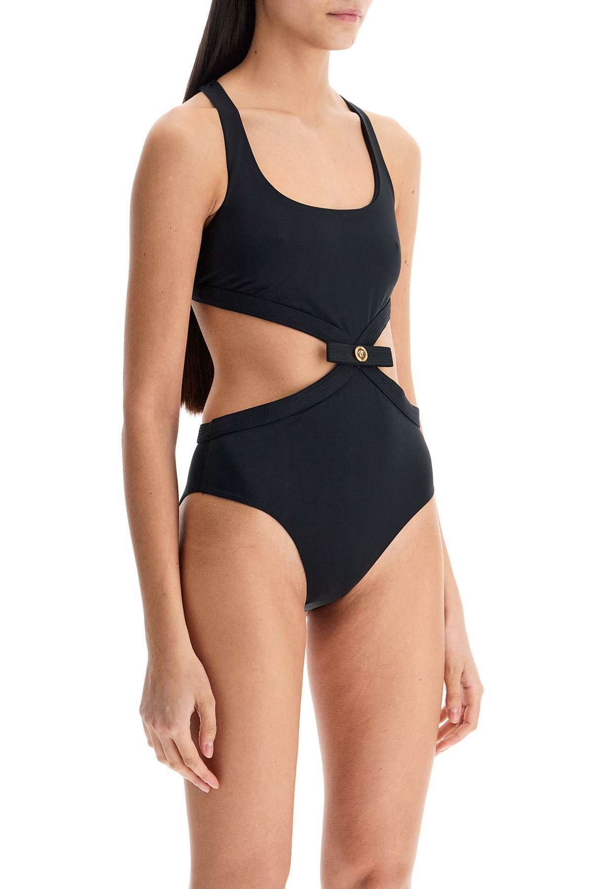 This Versace one-piece swimsuit is made of lycra and decorated with the iconic 'Gianni ribbon', complete with a golden Medusa appliquAⓒ on the front